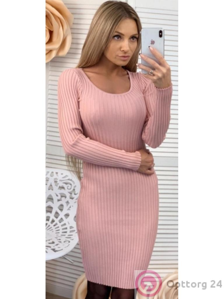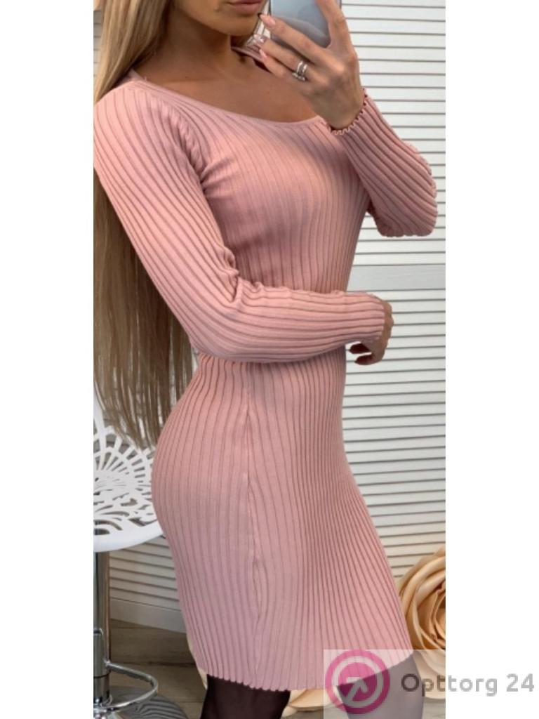 Стильное женское платье розового цвета с круглым вырезом на груди и длинными рукавами. Длина чуть выше колена. Приталенный силуэт.