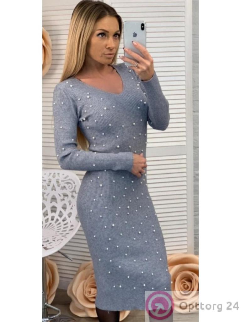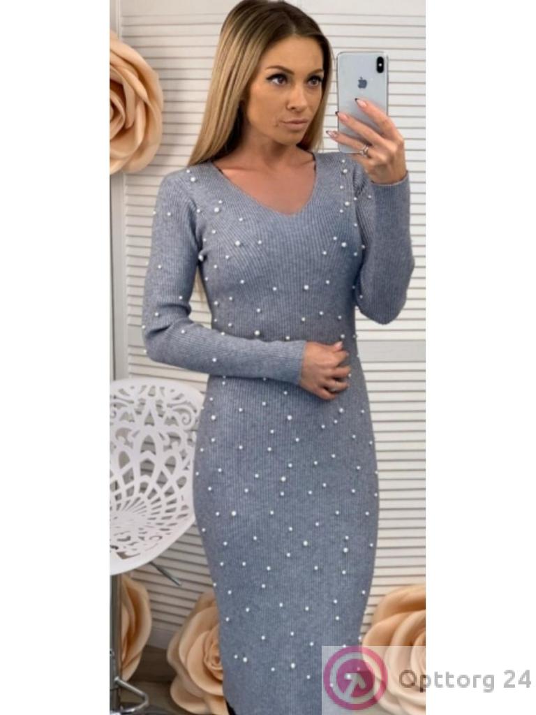 Платье женское вязаное серое с нашивкой из бусин оптом