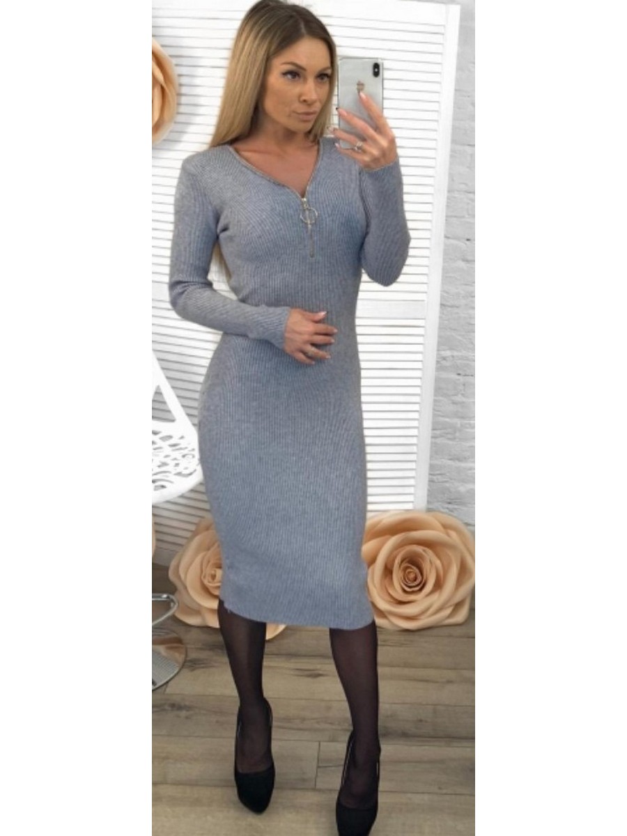 Модное вязаное платье серого цвета с вырезом, который регулируется молнией. Длина ниже колена. Приталенная модель.