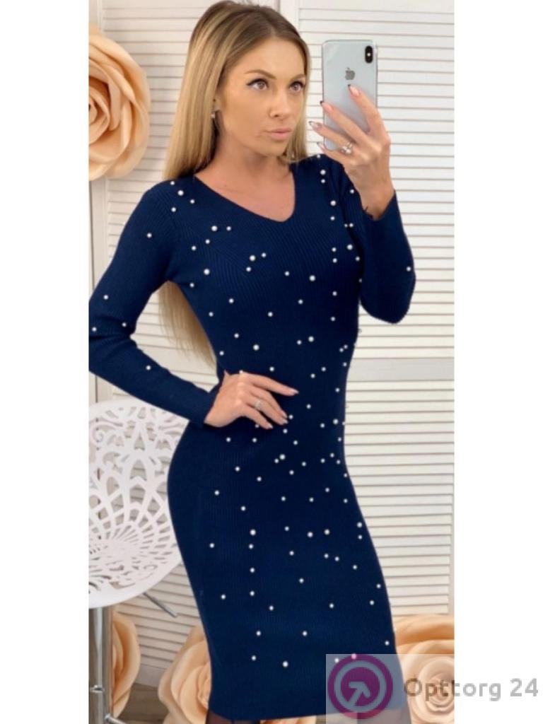 Платье женское вязаное синее с нашивкой из бусин оптом