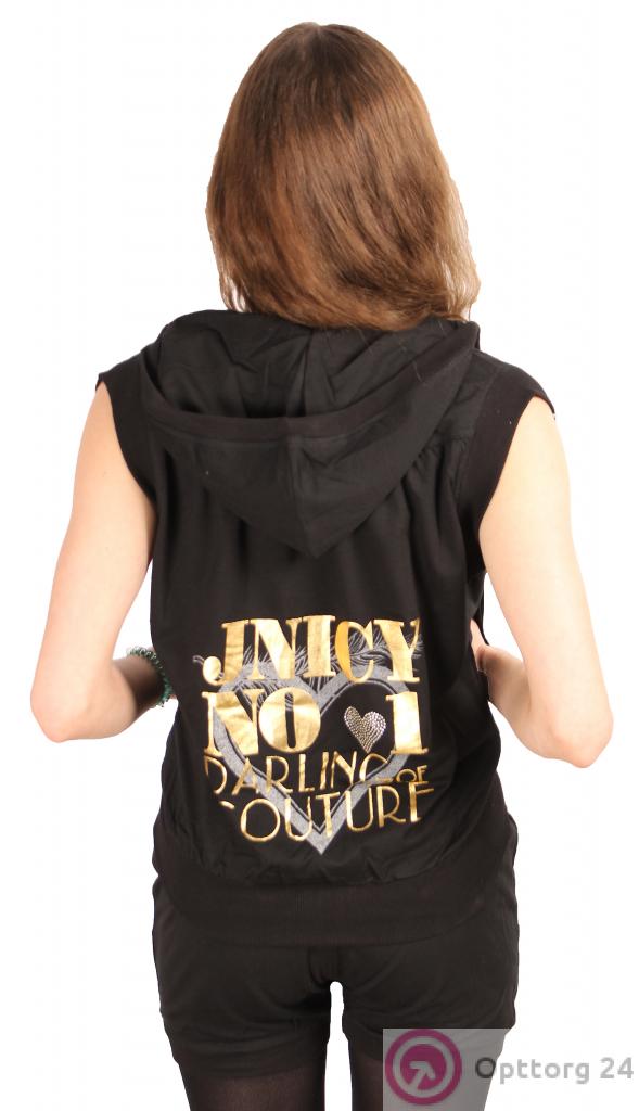 Подростковый спортивный костюм черного цвета на молнии с золотистыми надписями.