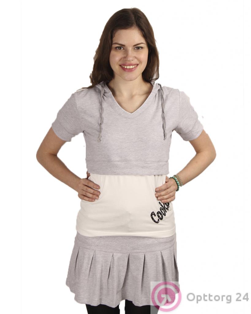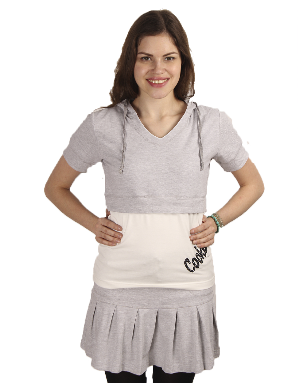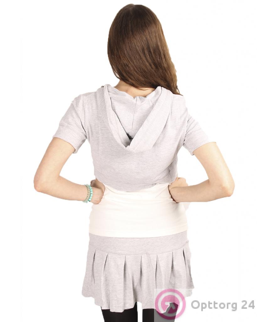 Костюм подростковый серо-белого цвета, модель состоит из футболки с капюшоном и юбки.