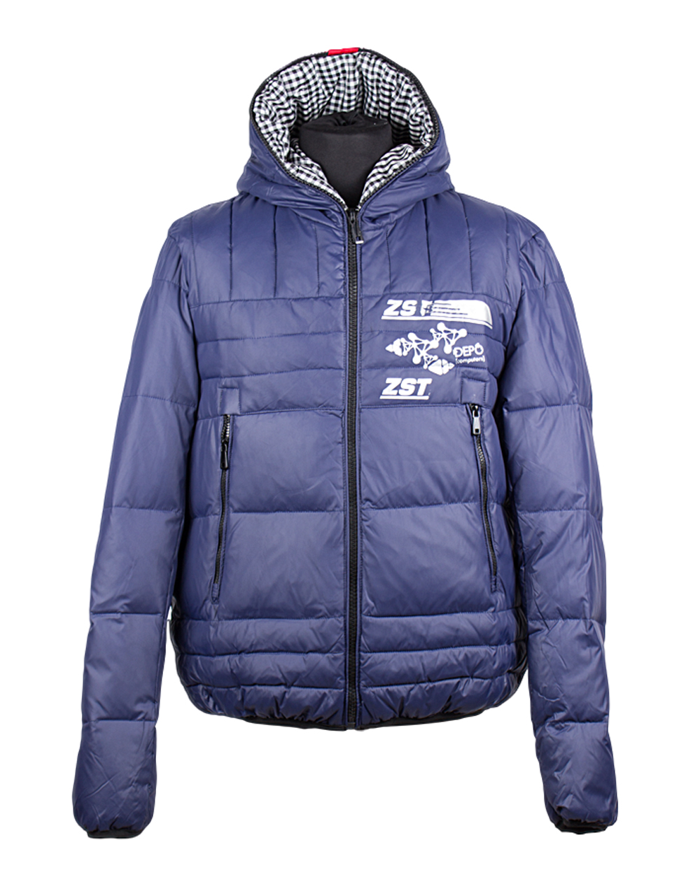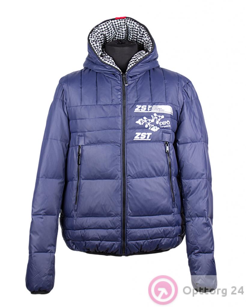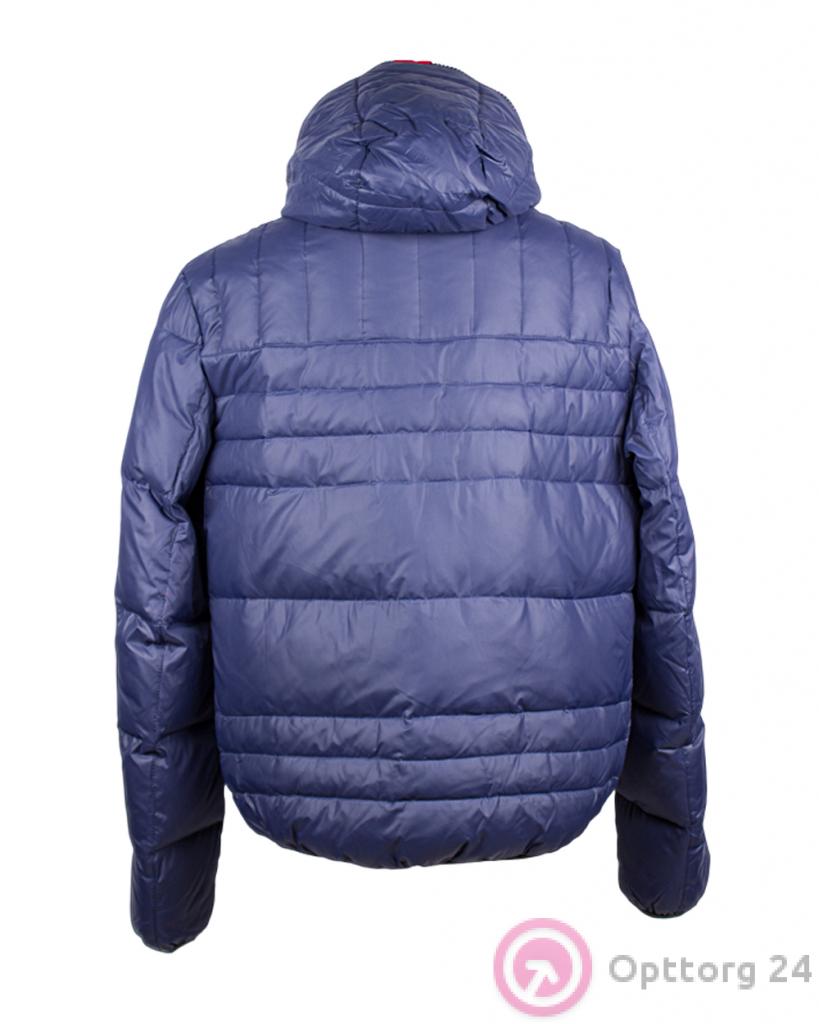 Пуховик короткий с капюшоном, на молнии, синего цвета оптом