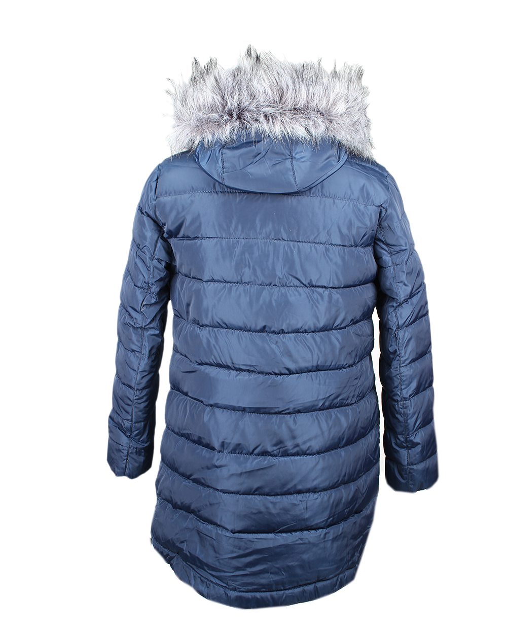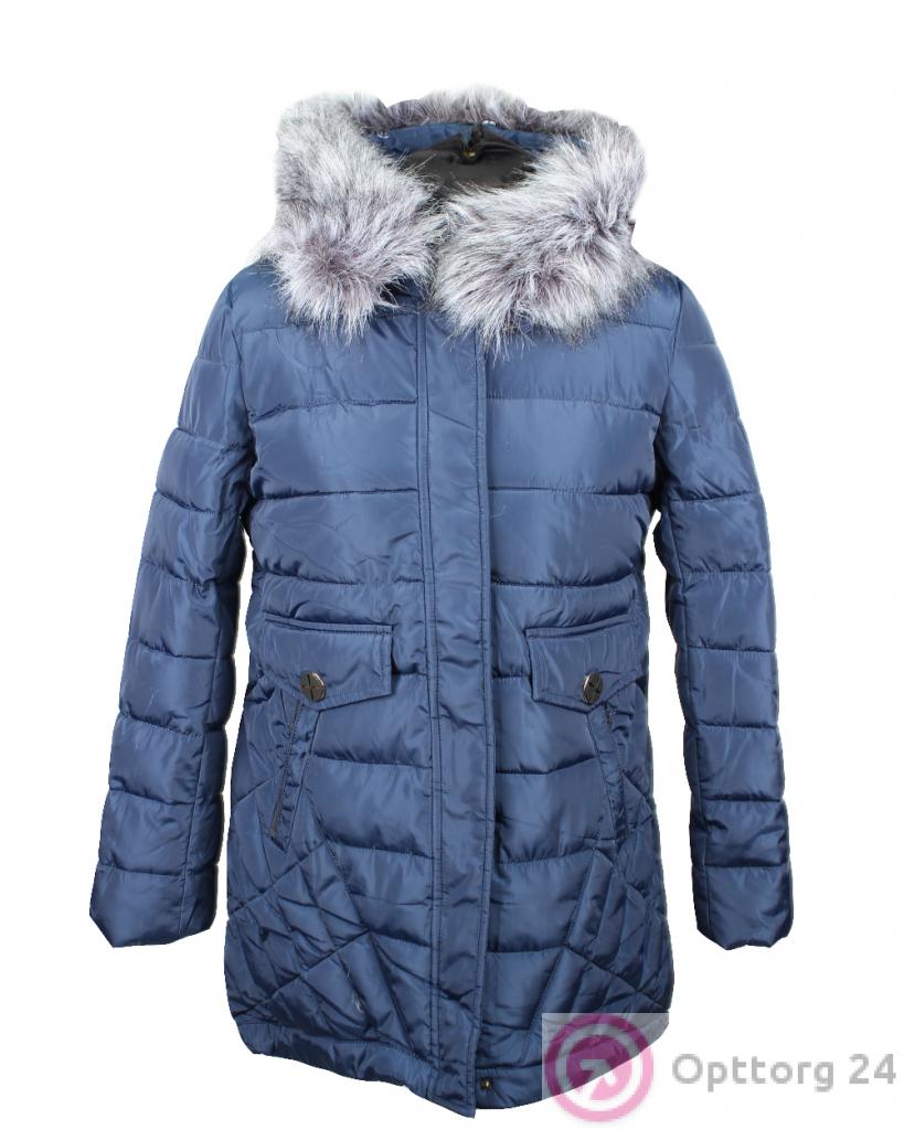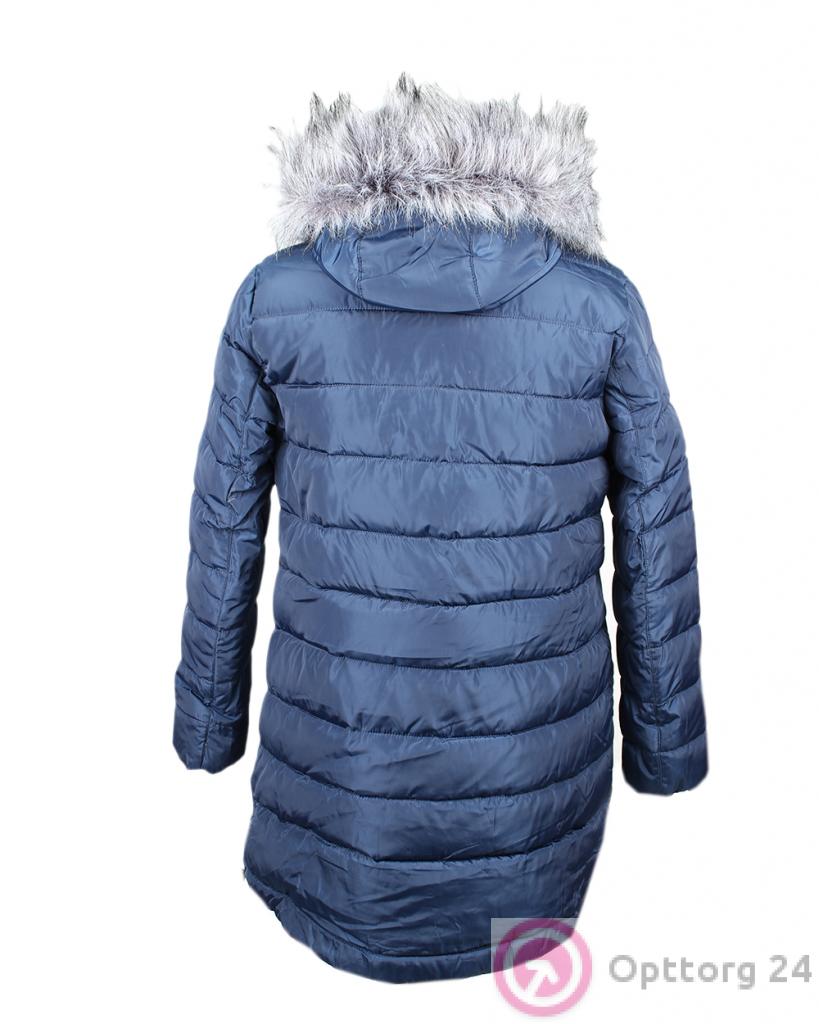 Стеганый женский пуховик синего цвета. Модель украшена искуственным мехом на воротнике.