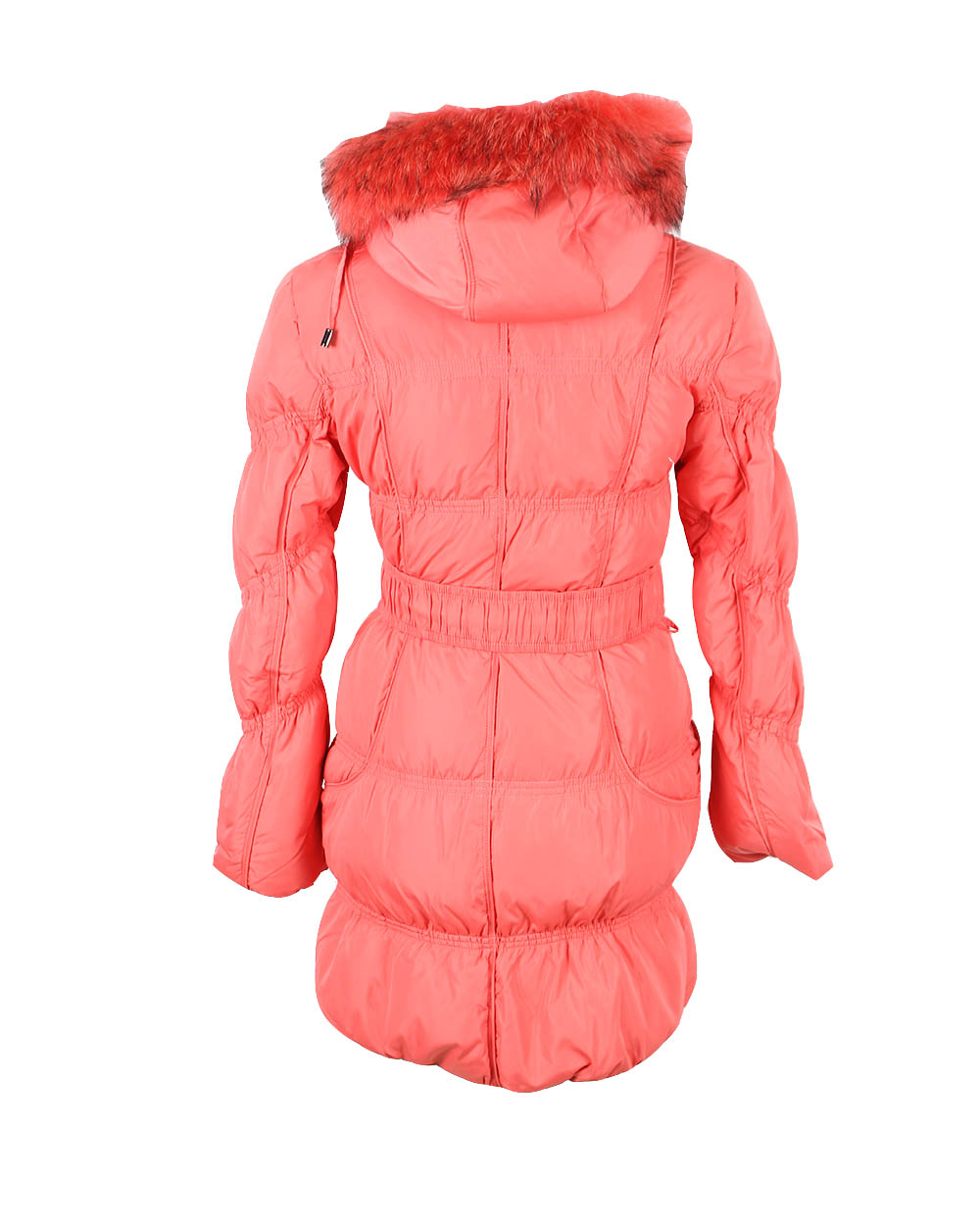 Женский пуховик на молнии. Модель имеет длину чуть ниже колена. На капюшоне мех песца.