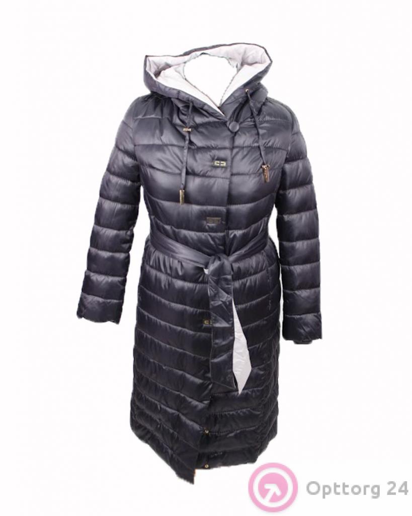 Женский пуховик с поясом на талии. Застегивается на заклепки. Капюшон с кулисками для утяжки.