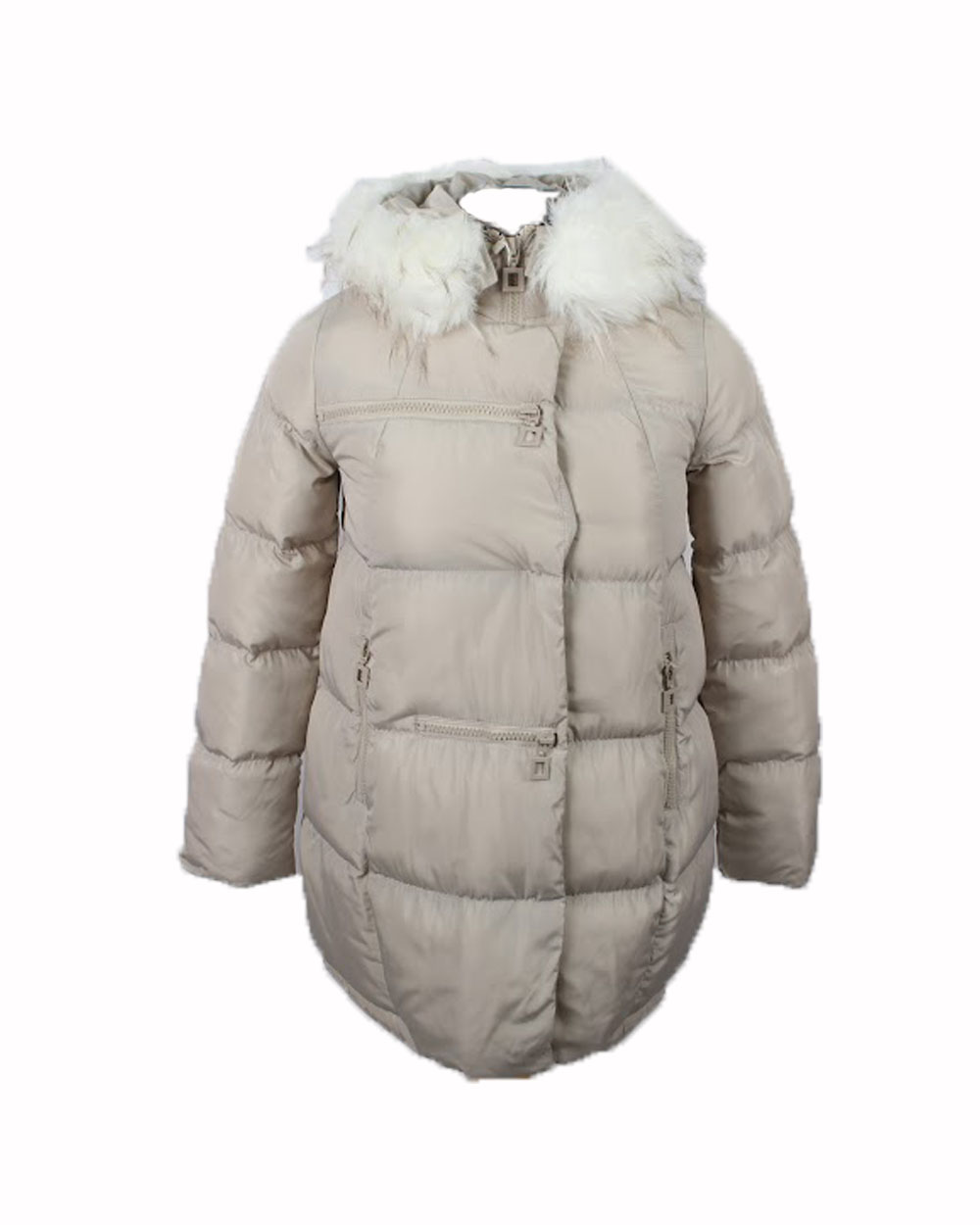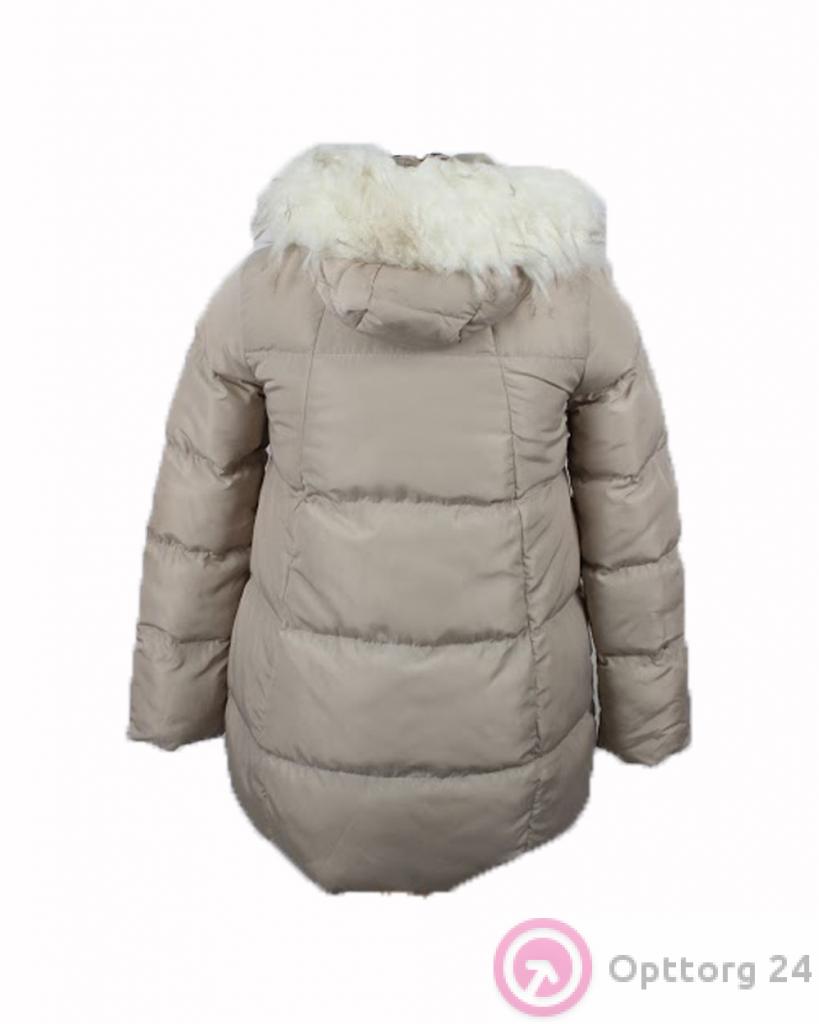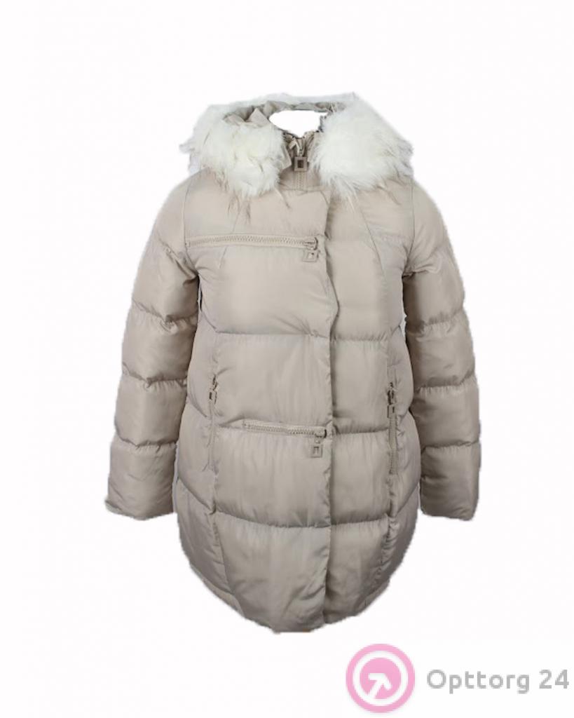 Женский пуховик бежевого цвета с застежкой молнией. Молния прикрыта ветрозащитной планкой.