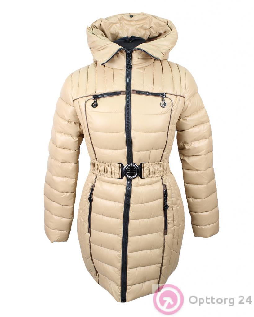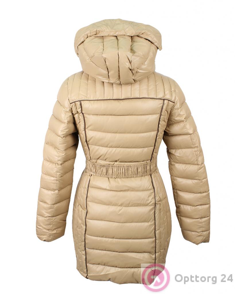 Женский пуховик бежевого цвета. Модель имеет пояс в комплекте. Карманы на молнии.