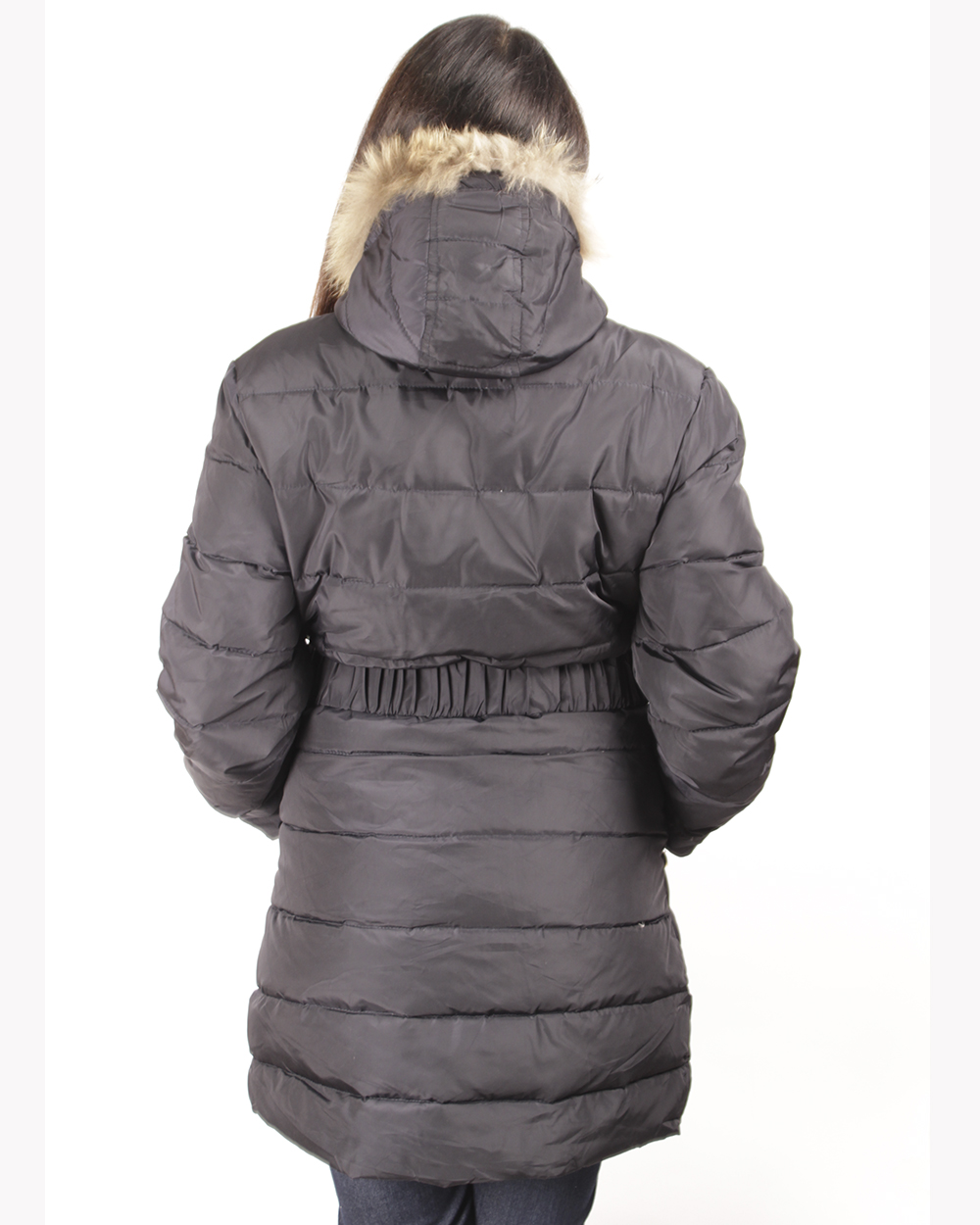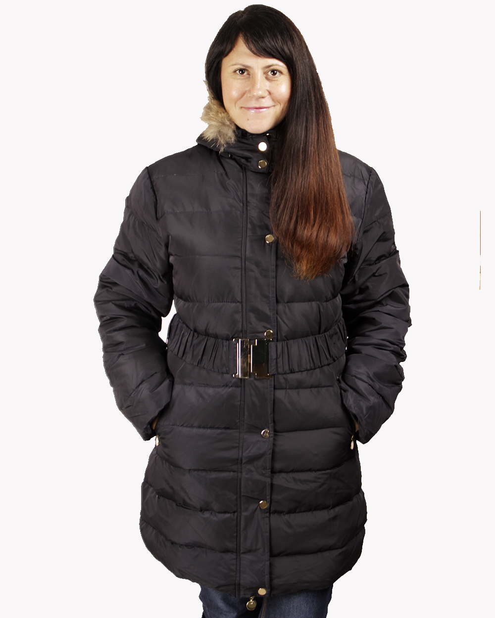 Женский пуховик черного цвета. Модель с поясом. Капюшон украшен натуральным мехом.