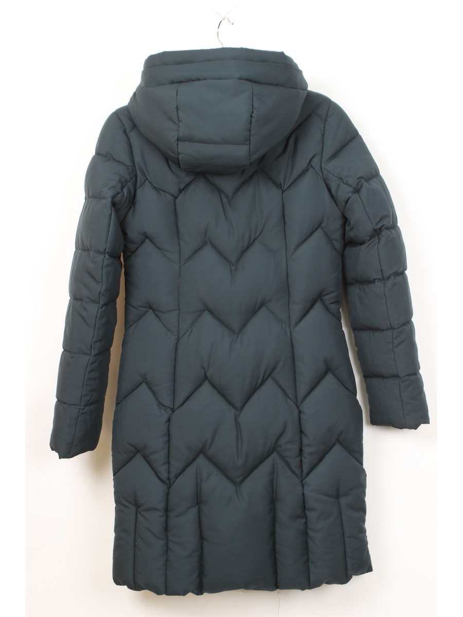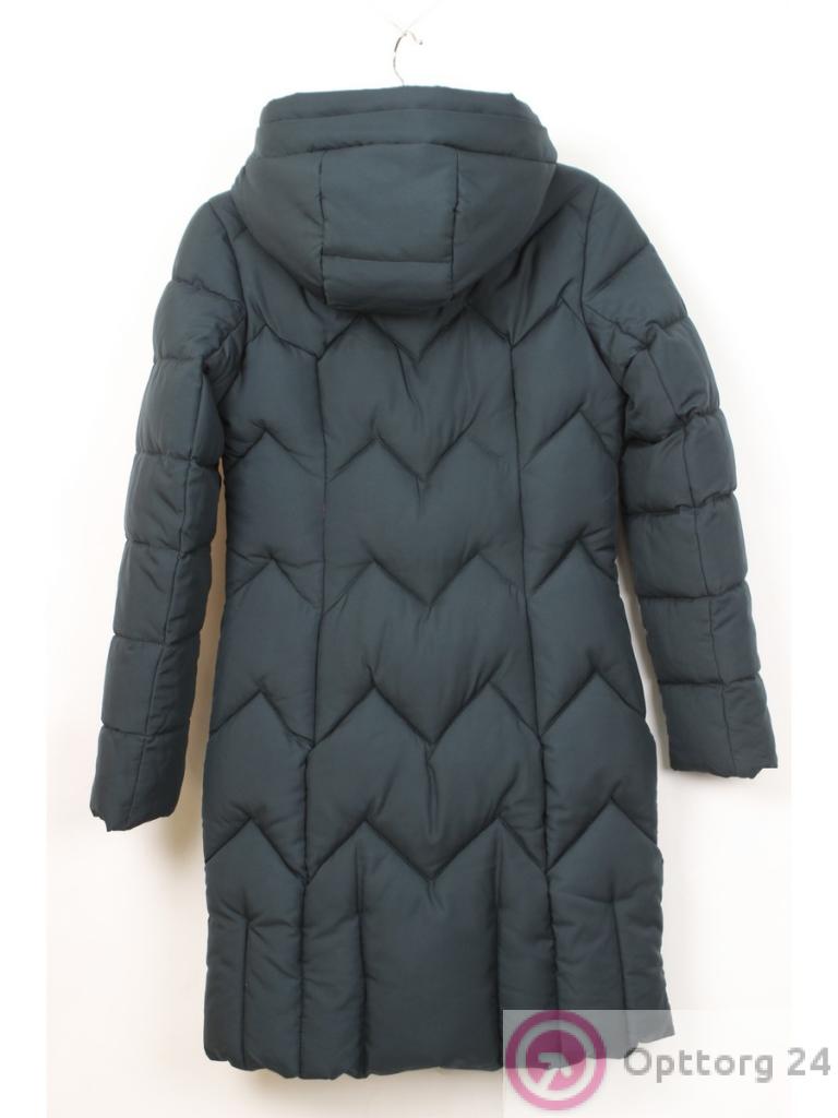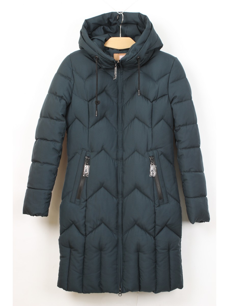 Женский пуховик черного цвета с карманами и капюшоном. Приталенная модель, длина до колена.