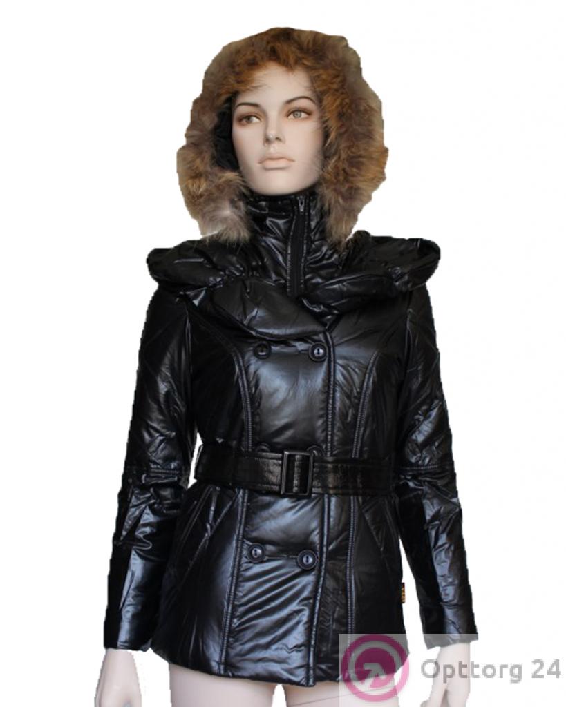 Пуховик женский чёрно-глянцевый с ремнём и мехом на капюшоне оптом
