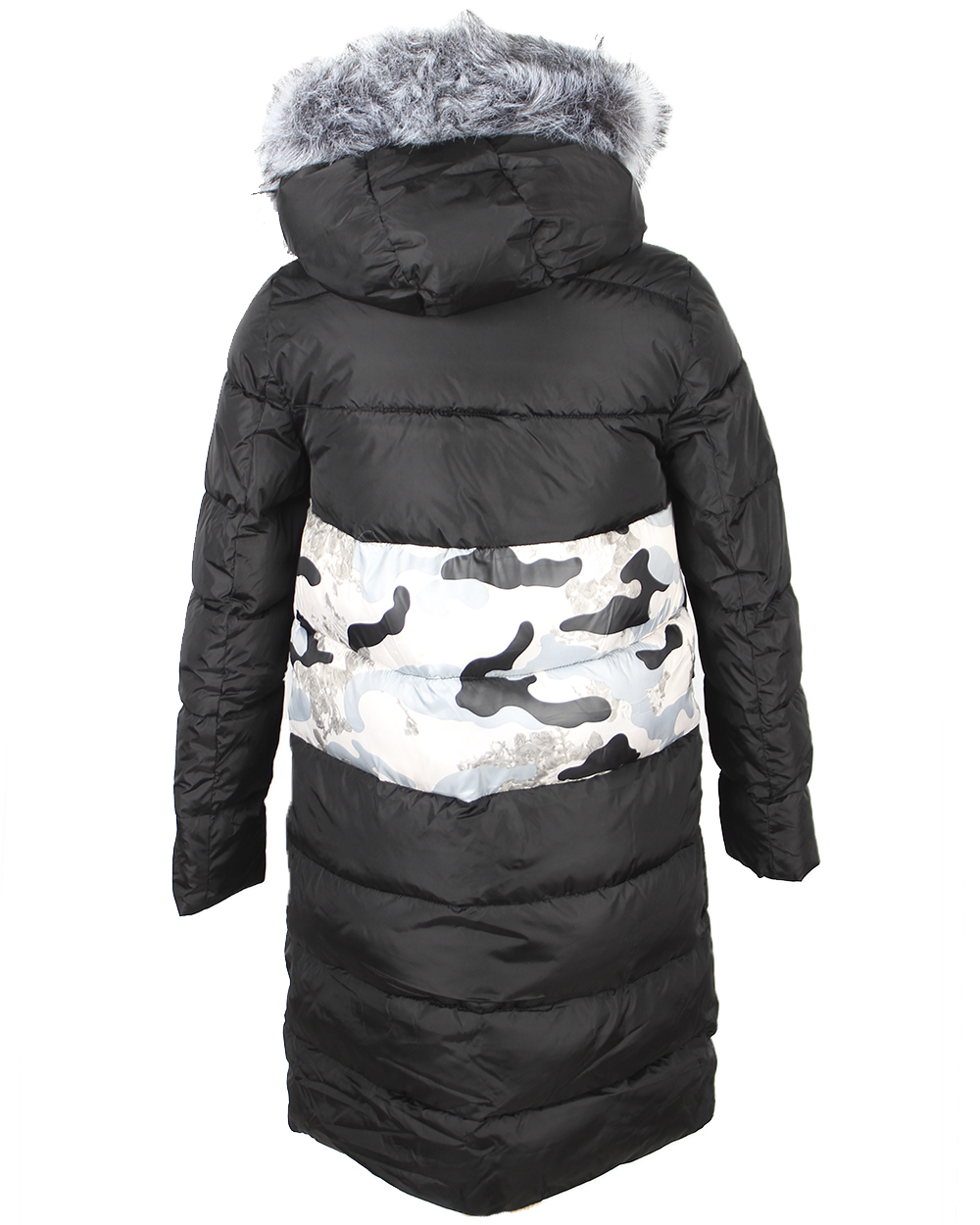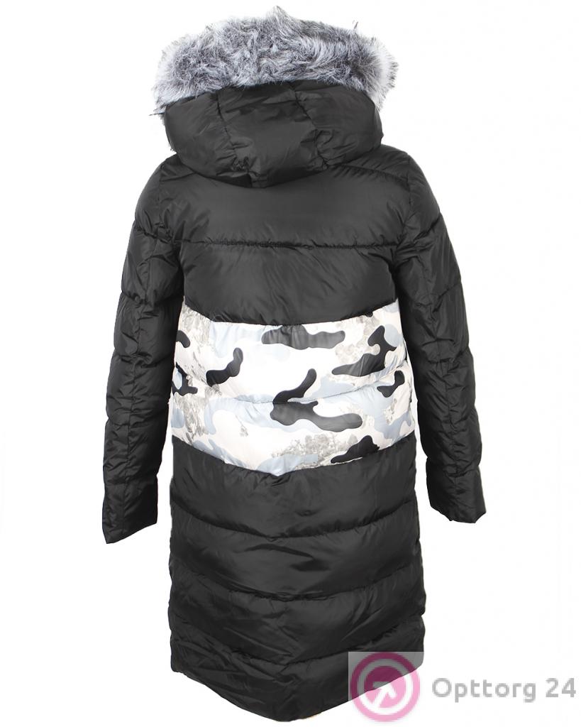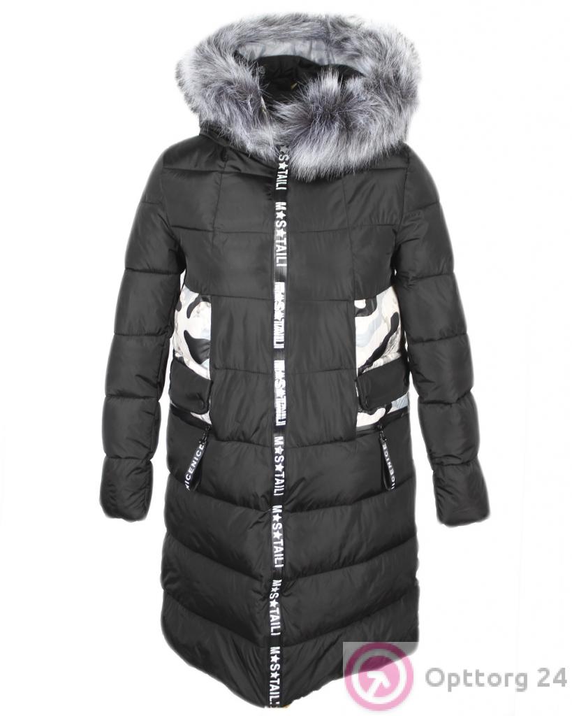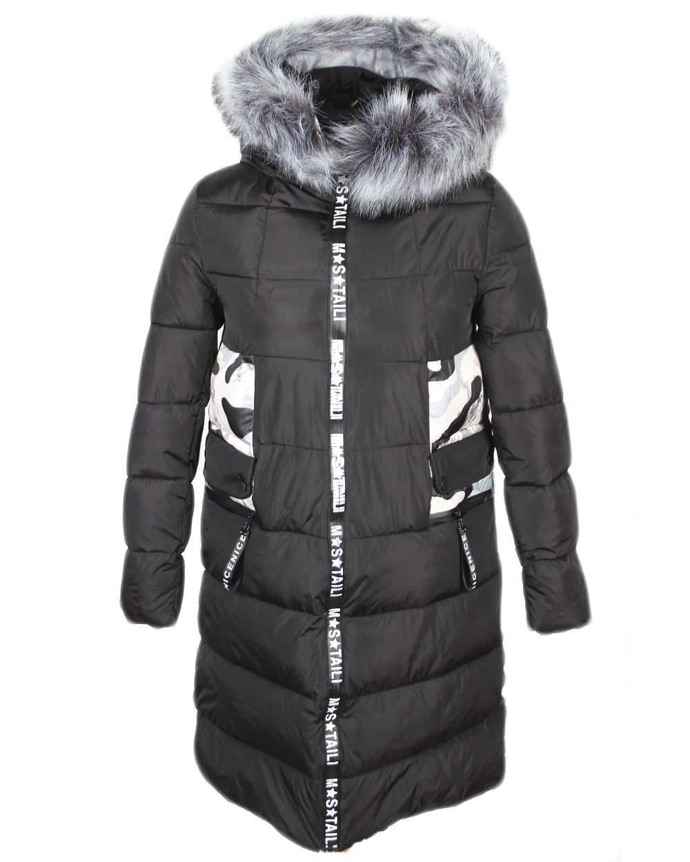 Пуховик женский чёрного цвета с мехом, вставкой в виде флоры и буквенным оформлением на молнии оптом