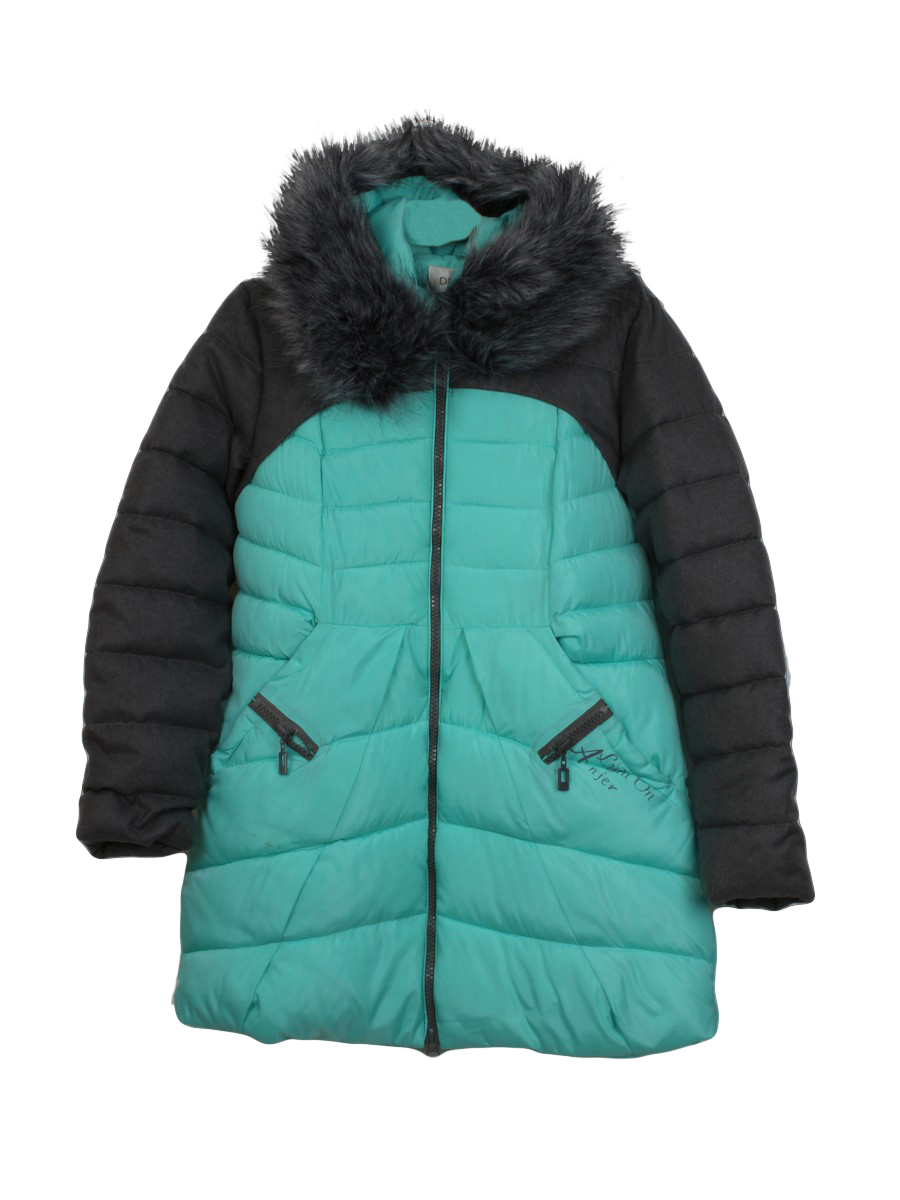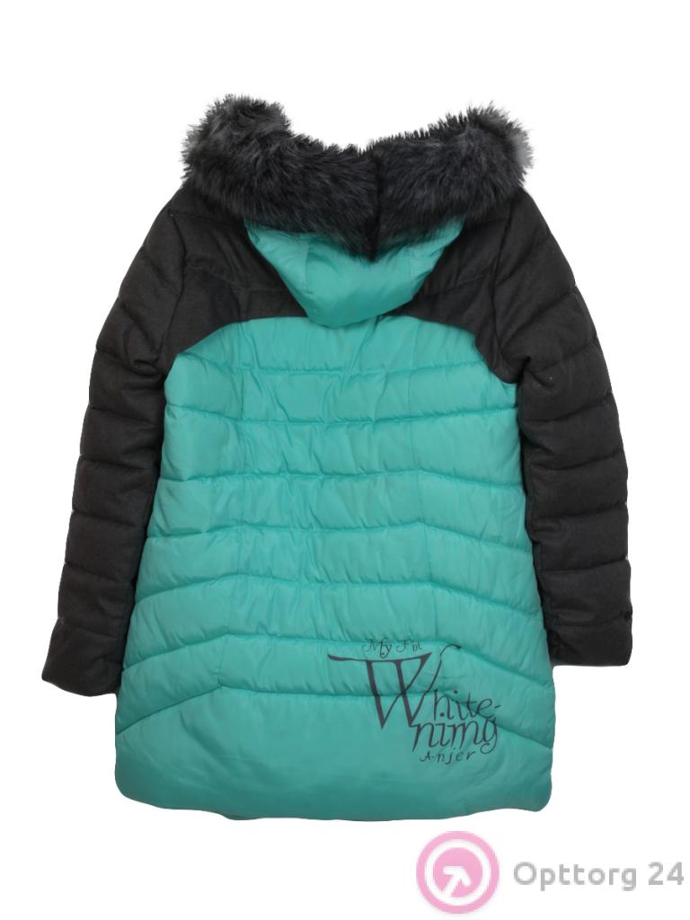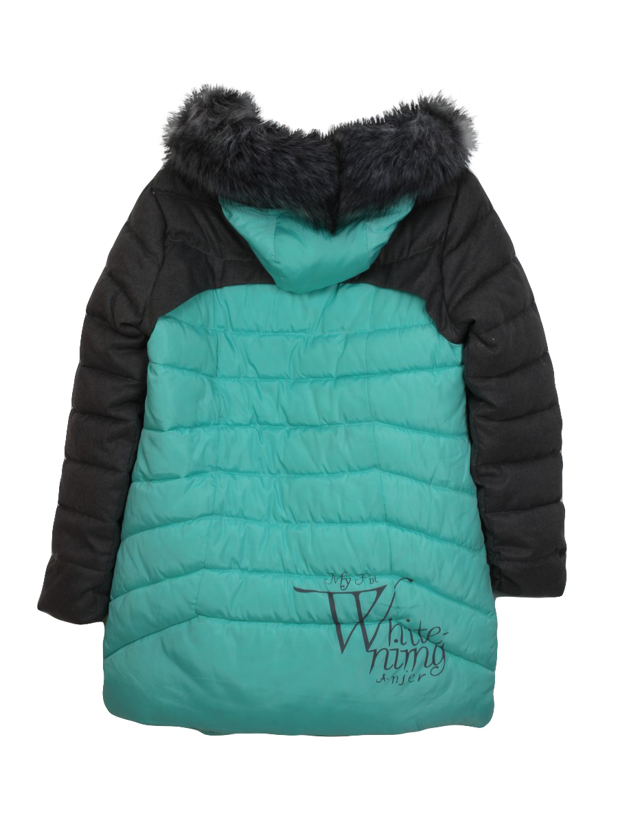 Женский голубой стильный пуховик с черными рукавами. Длина изделия выше колена. Капюшон украшен мехом.