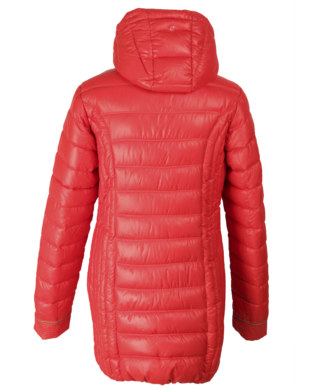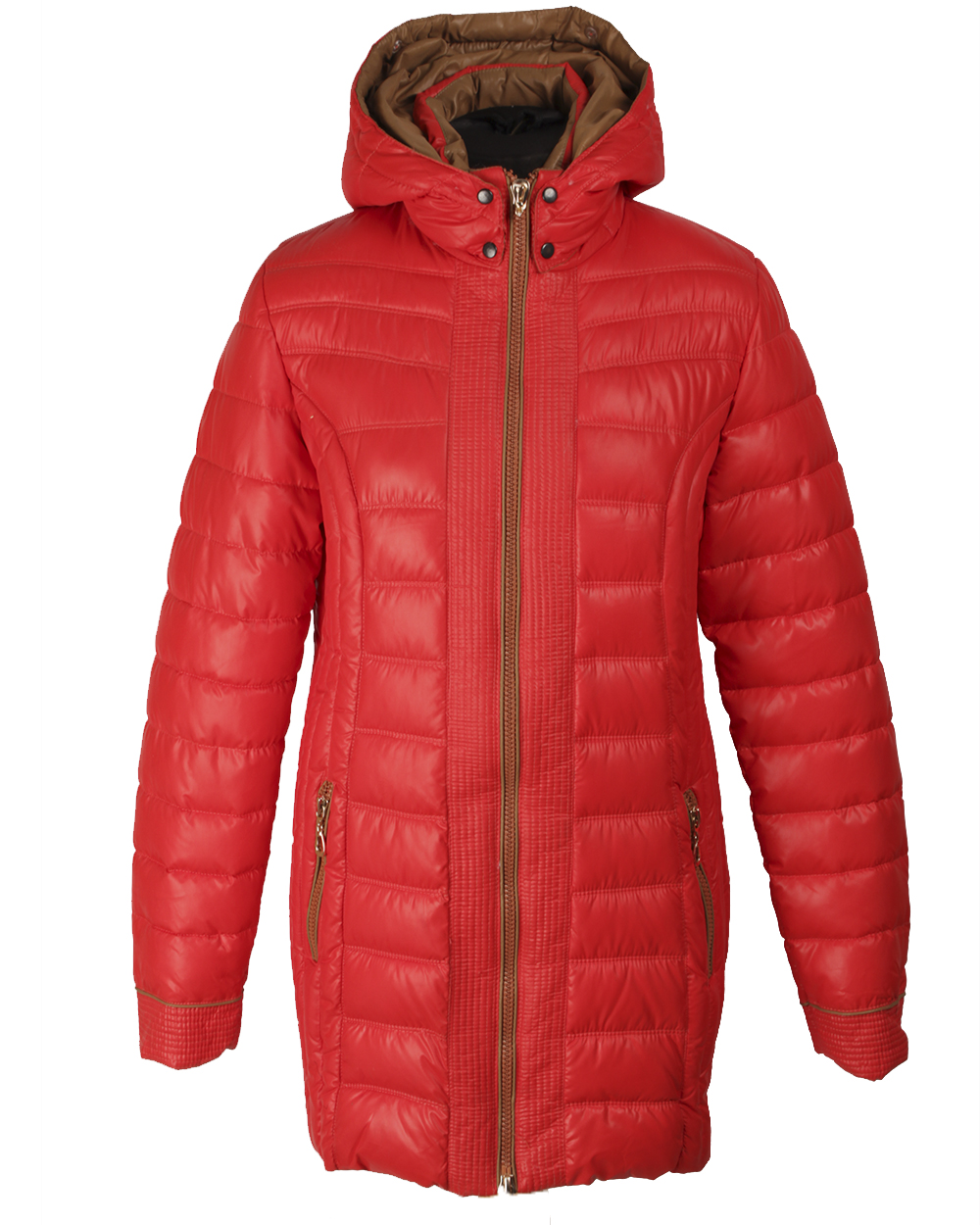 Пуховик женский, красного цвета с капюшоном на кнопках. Золотистая молня придаст больше привлекательности своим блеском.