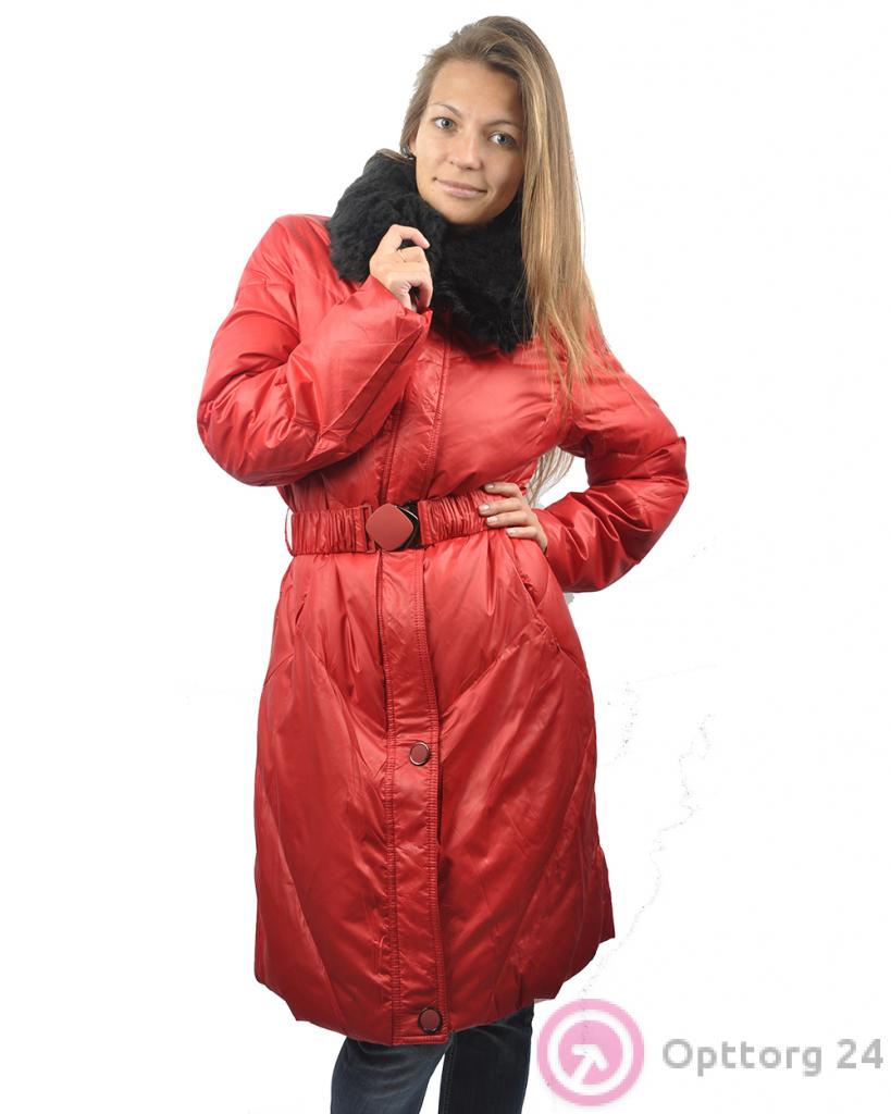 Пуховик женский красный с капюшоном и черной опушкой оптом