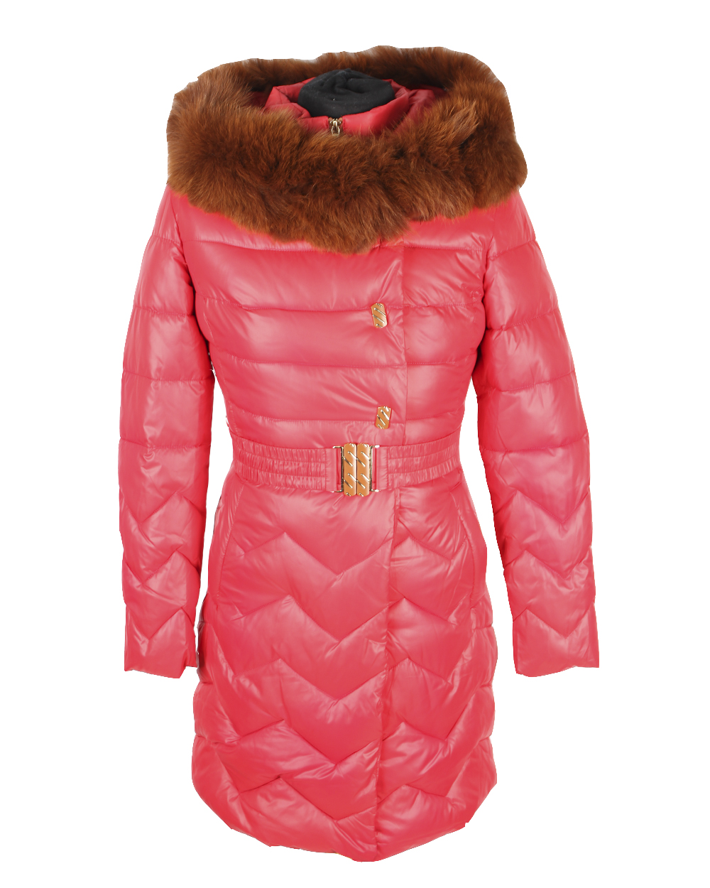 Красивый женский пуховик красного цвета. Модель имеет капюшон с мехом песца. На талии есть пояс.