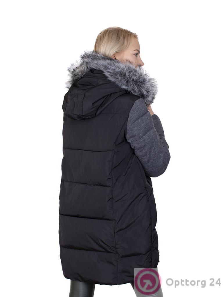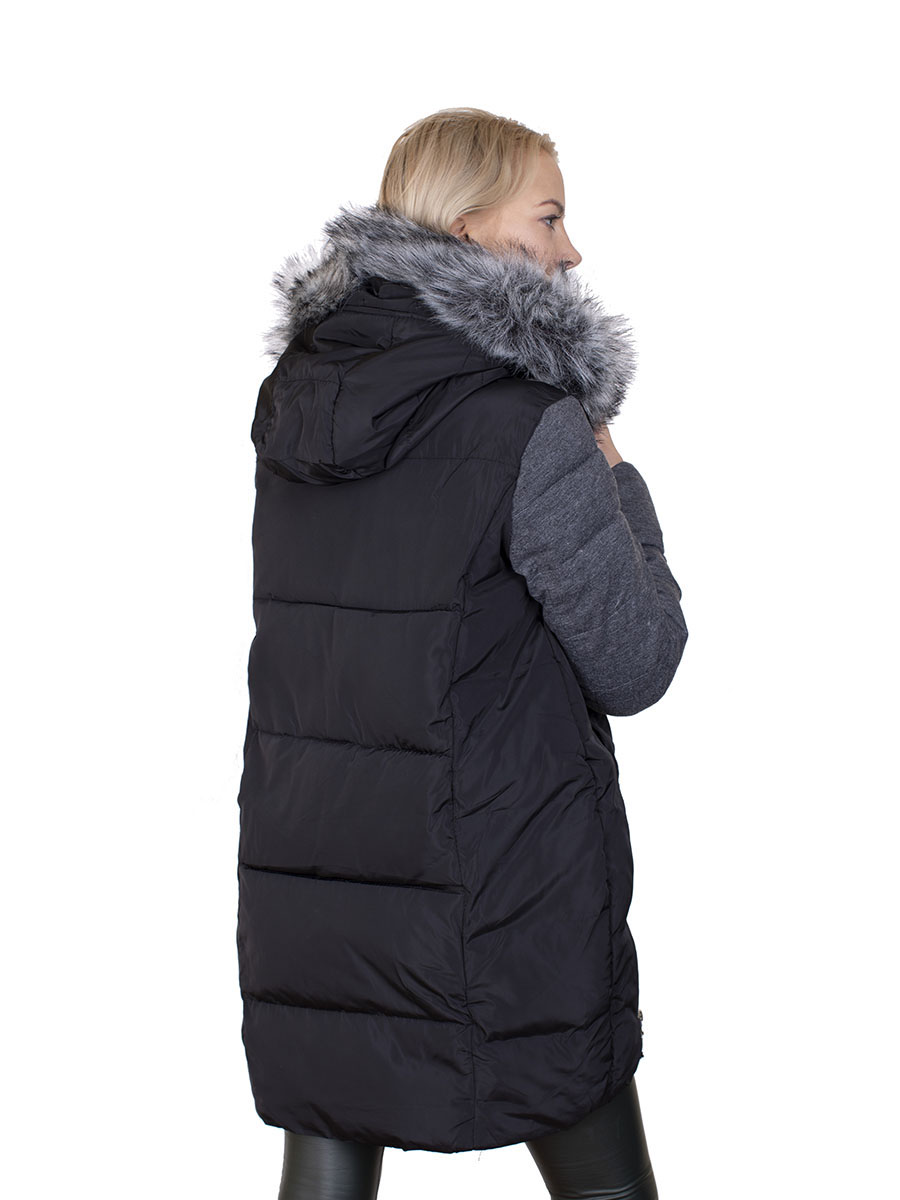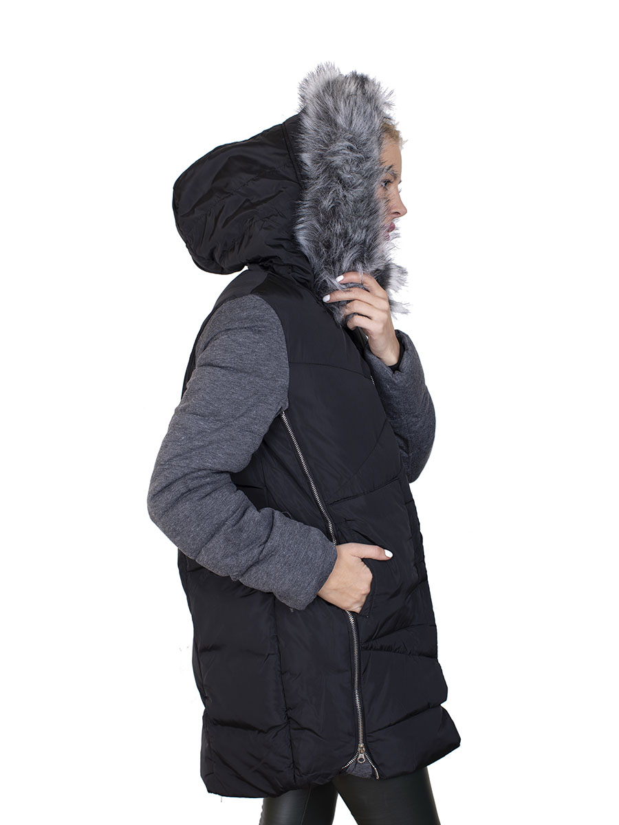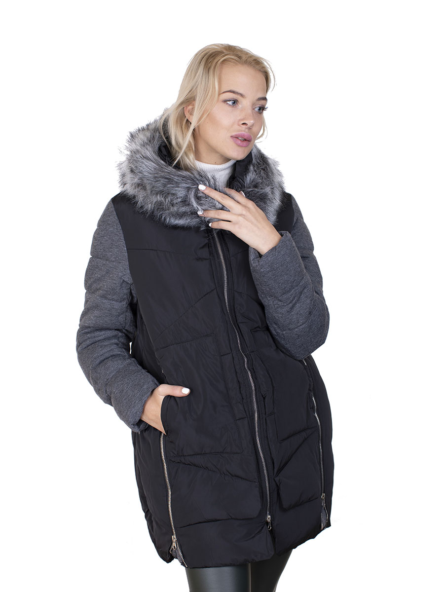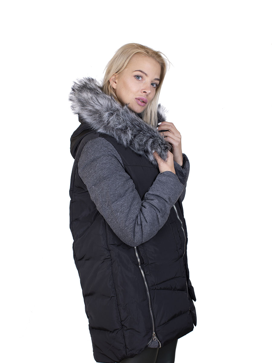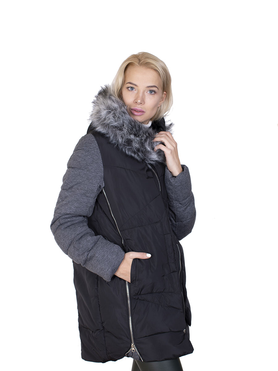 Описание: Пуховик женский с искусственным мехом на капюшоне. Цвет черно-серый. Застежка молния. Два кармана. По бокам две молнии.