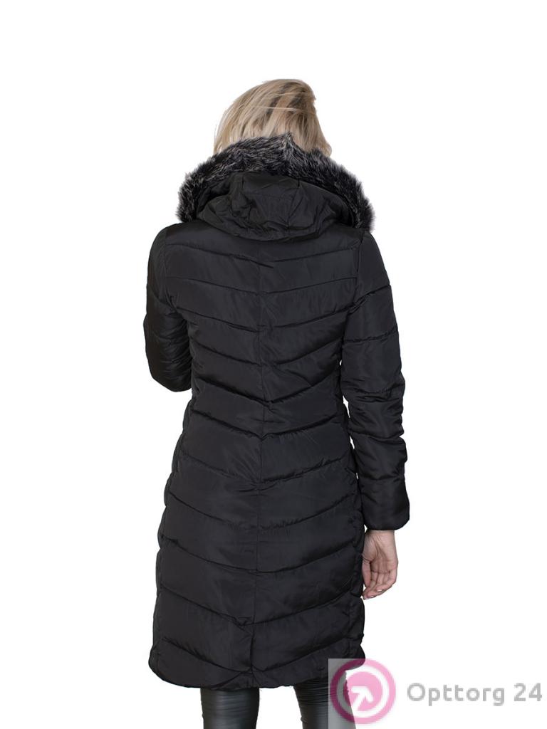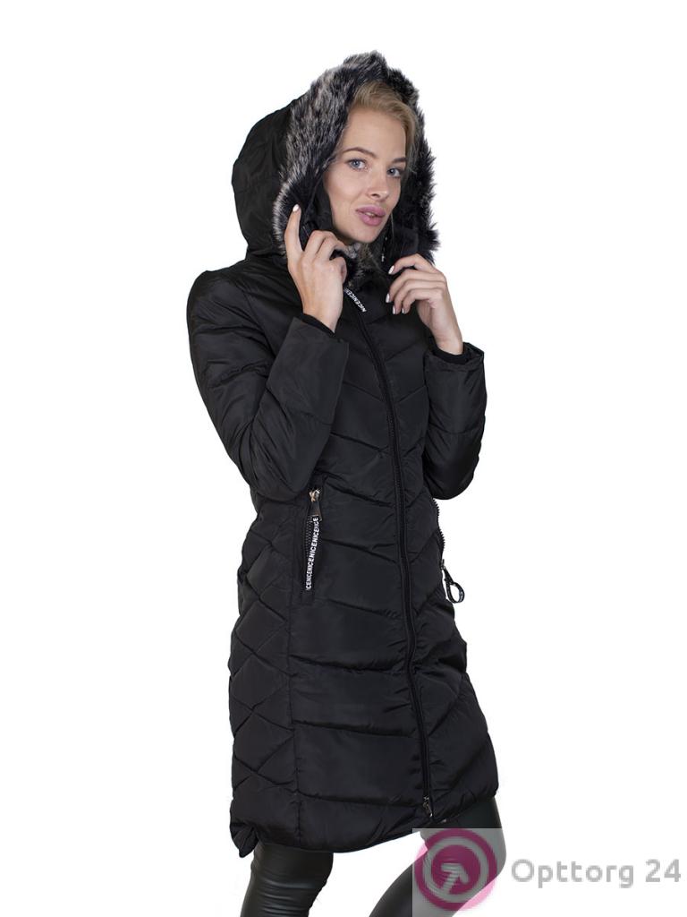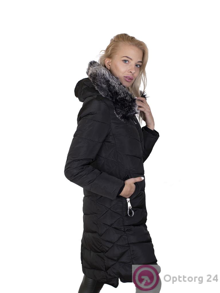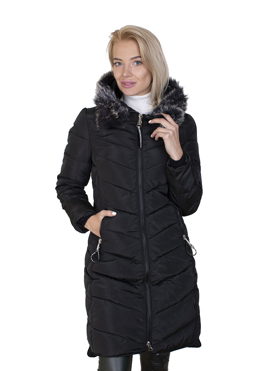 Описание: Пуховик женский приталенный черного цвета. Капюшон с искусственным мехом. Два кармана на молнии, застежка молния.