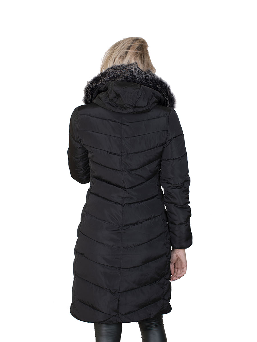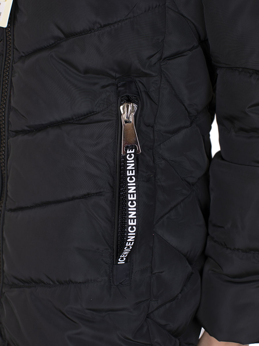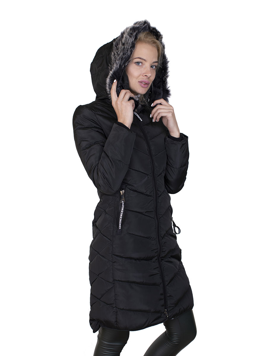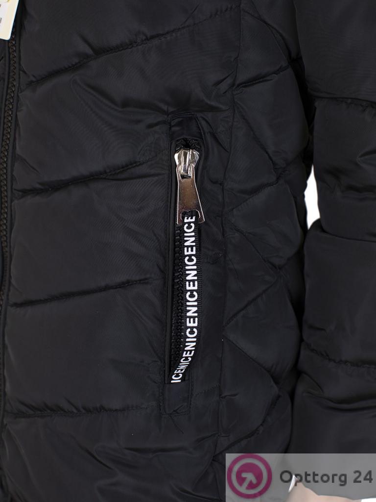 Описание: Пуховик женский приталенный черного цвета. Капюшон с искусственным мехом. Два кармана на молнии, застежка молния.