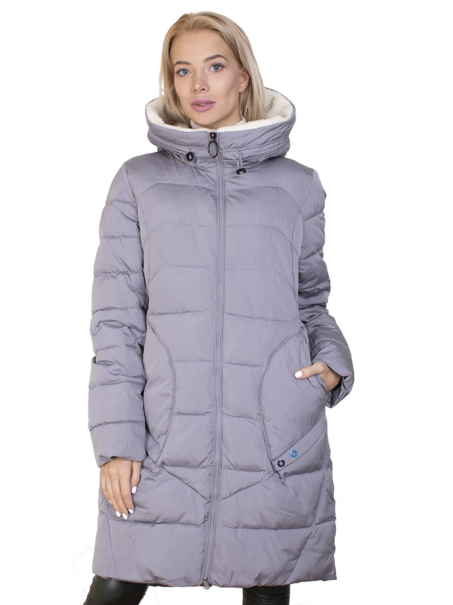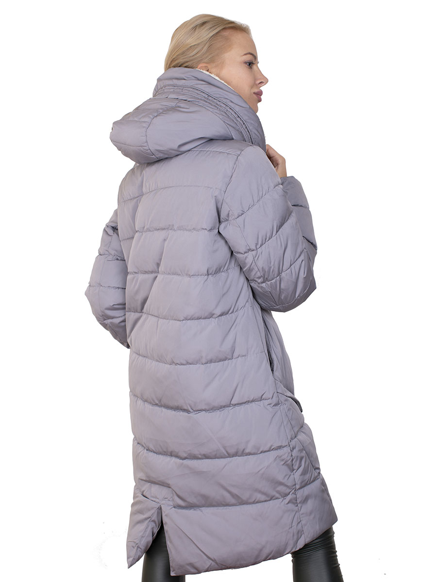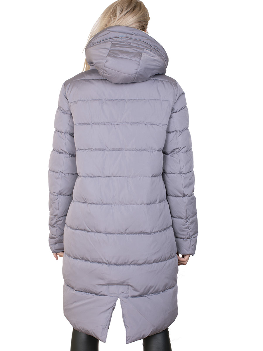 Описание: Пуховик женский серого цвета с капюшоном. Есть два кармана, застежка молния.