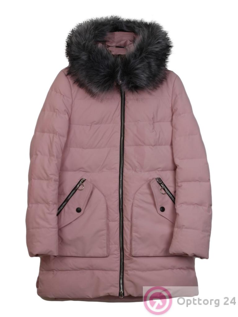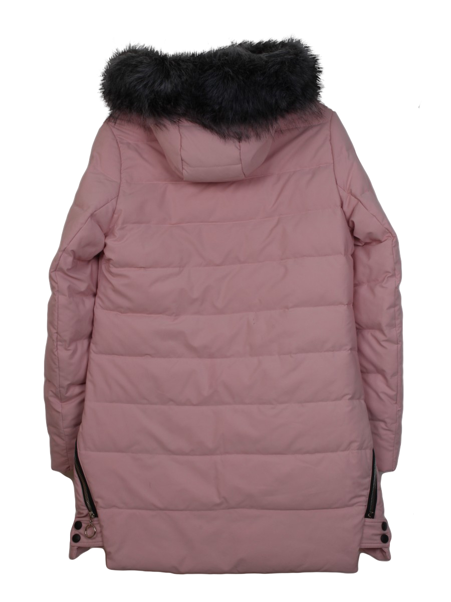 Женский розовый пуховик с карманами и капюшоном, украшенным черным мехом. По середине изделия - металлическая молния. Длина выше колена.