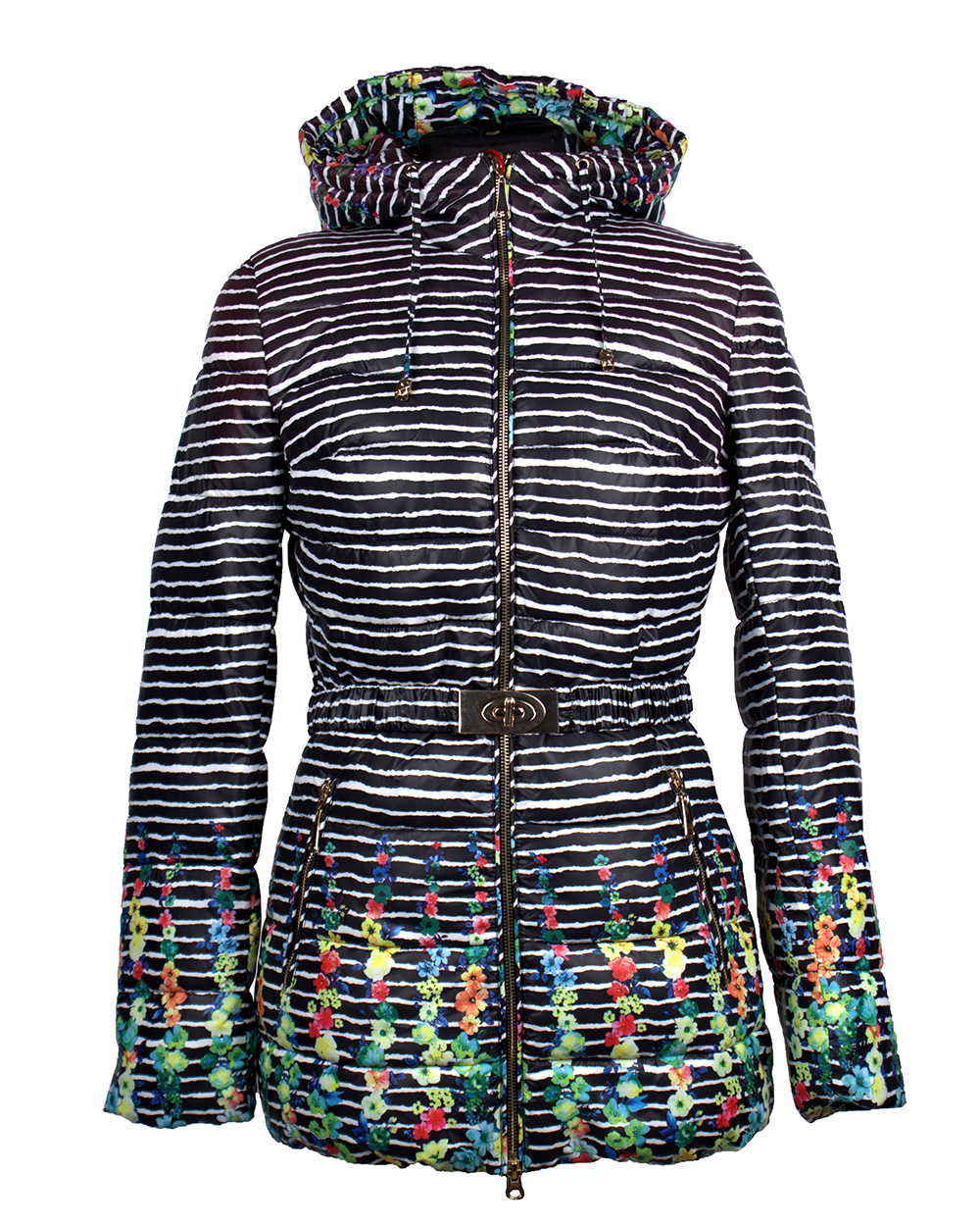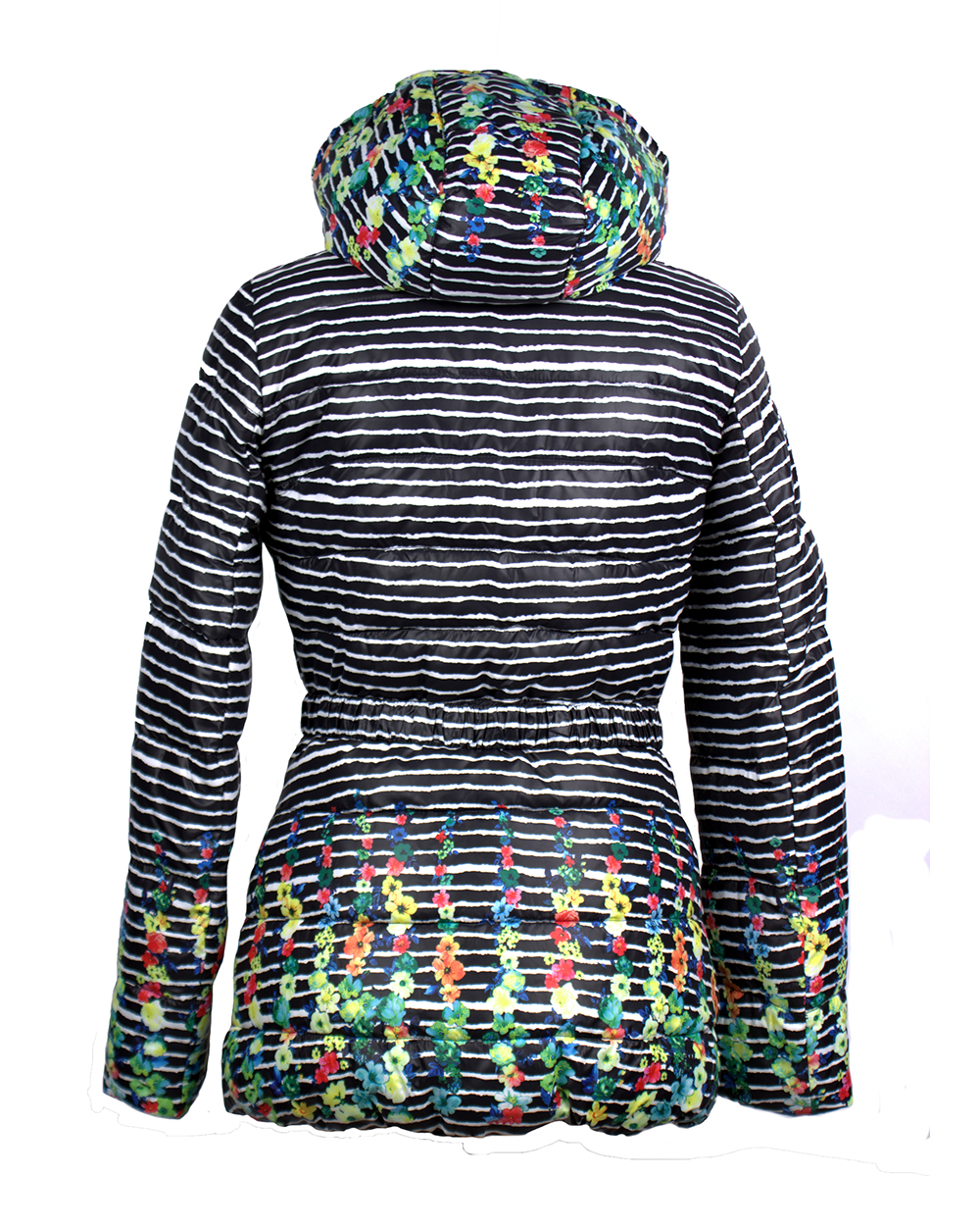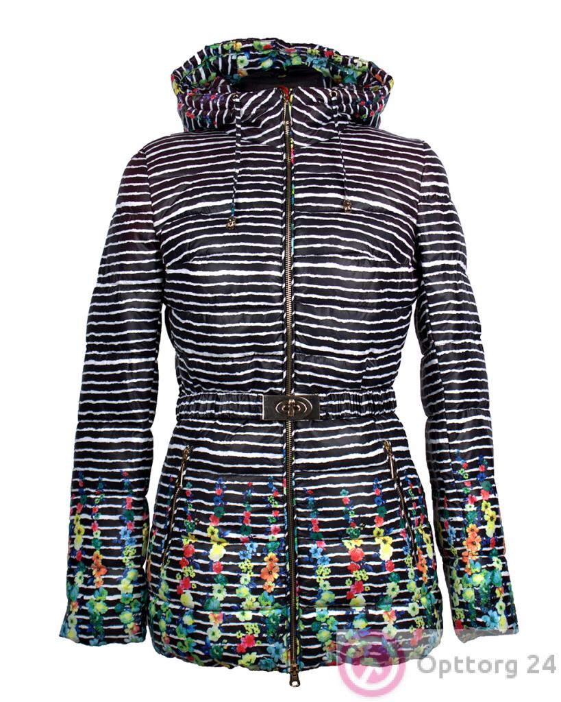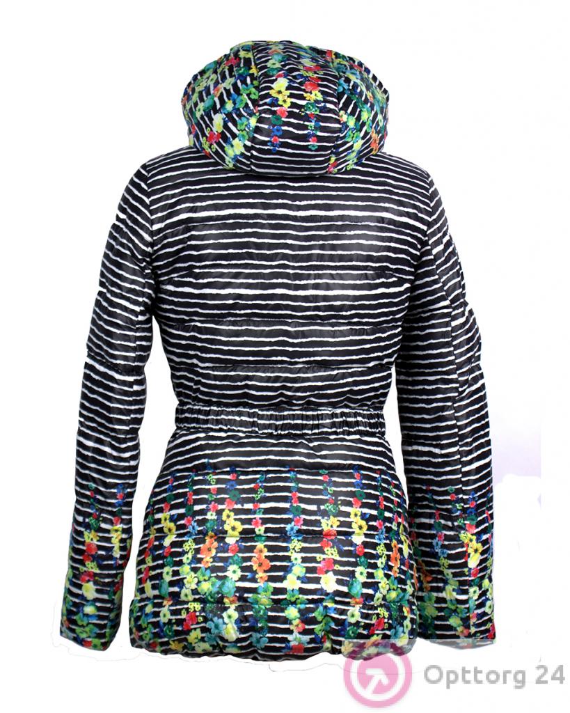 Пуховик женский с цветочным узором чёрный в белую полоску купить оптом