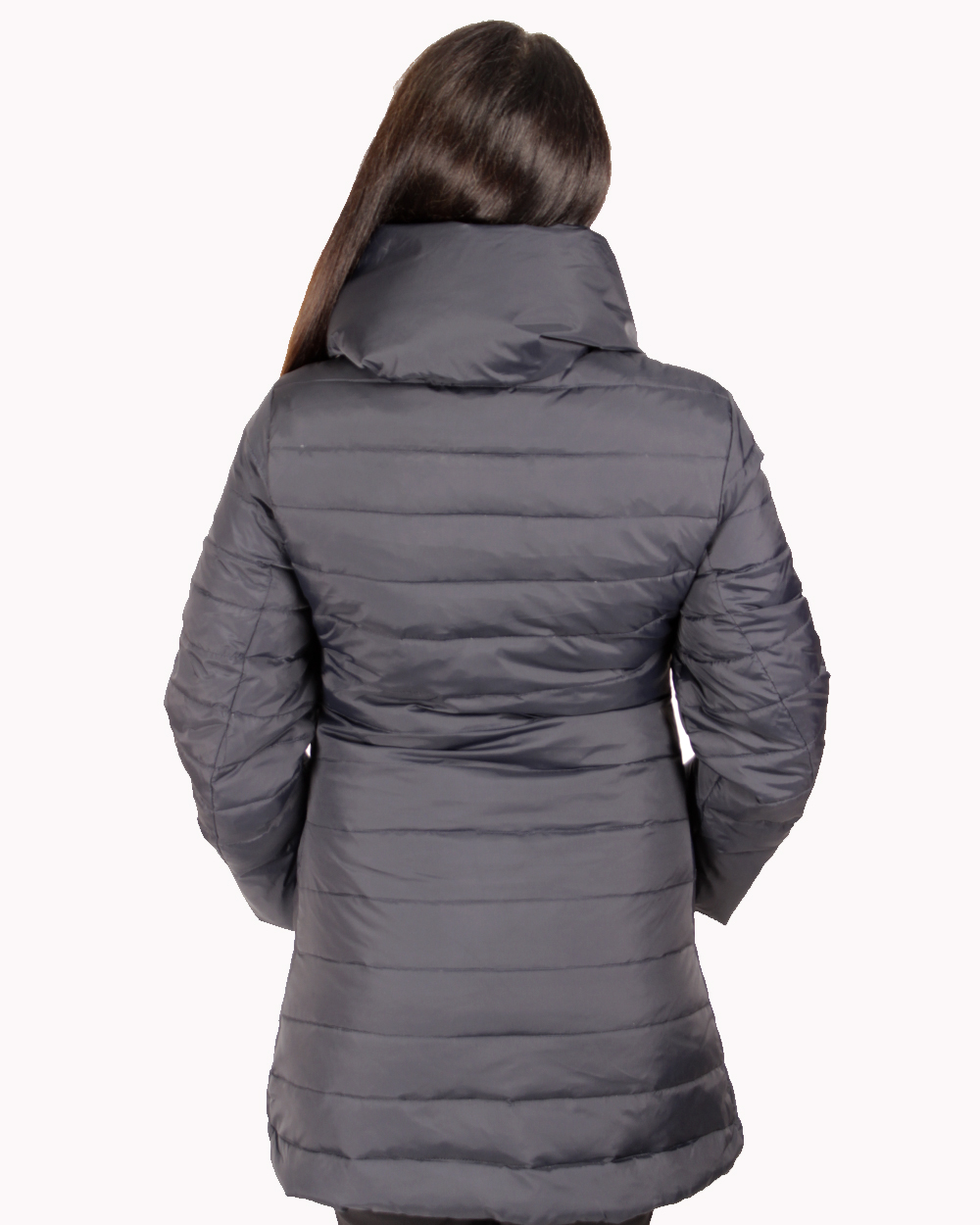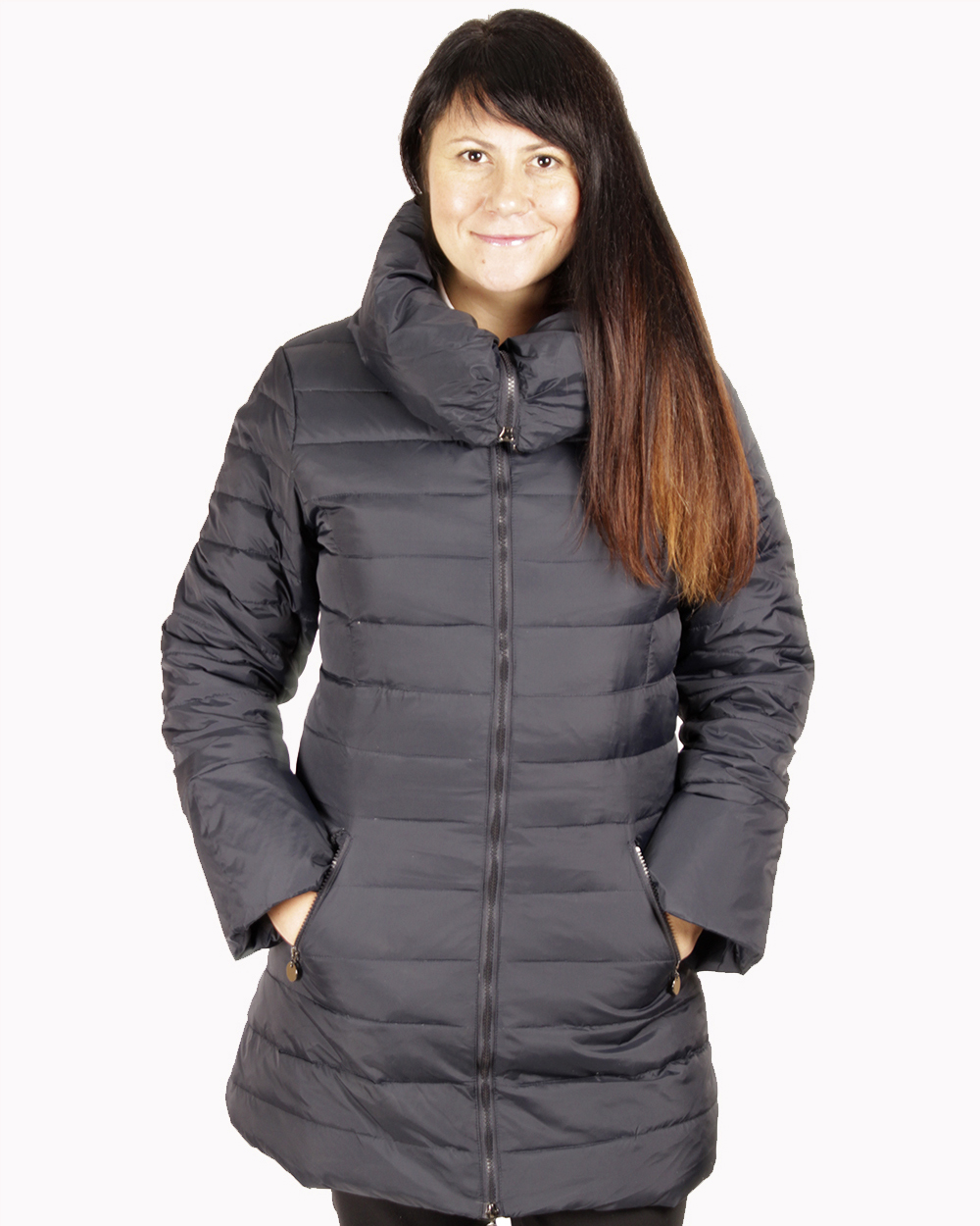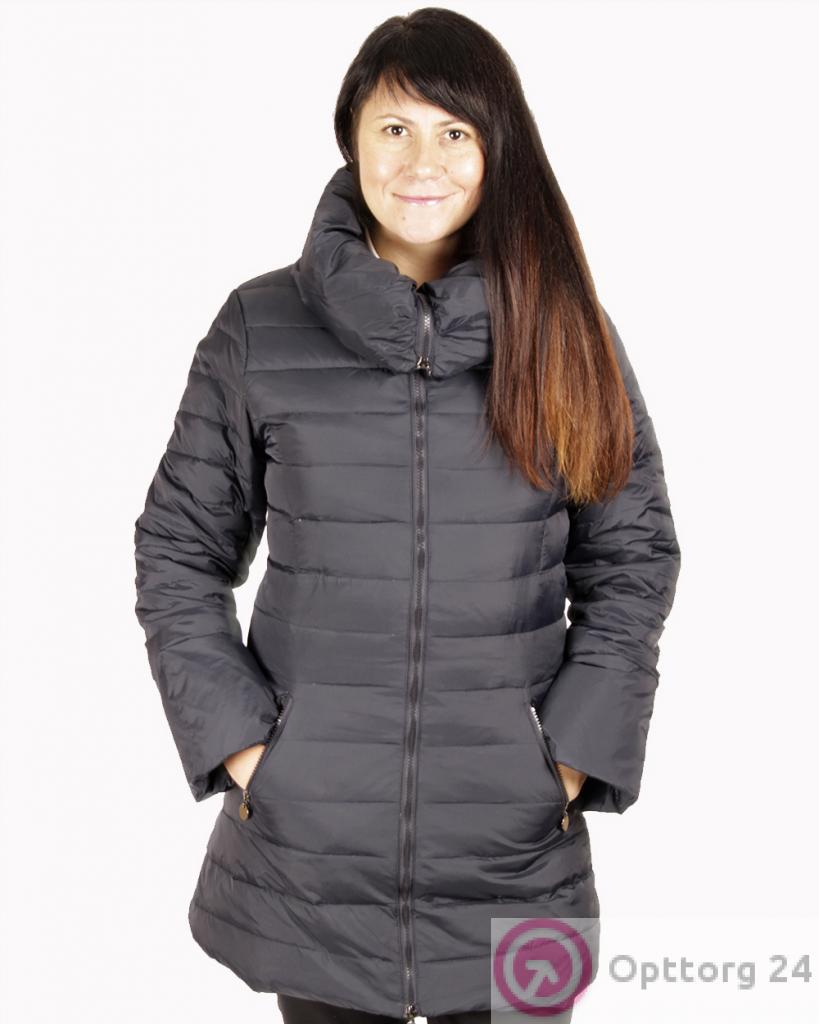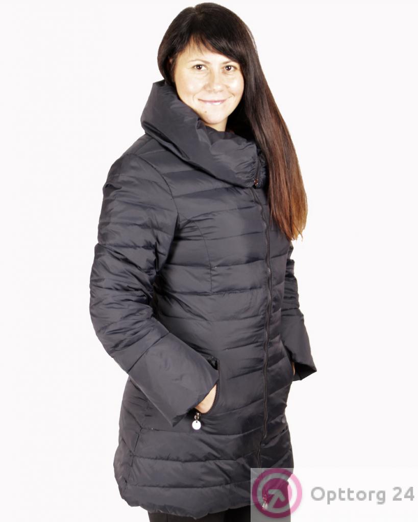Женский стильный пуховик, стёганный по всей длинне, черного цвета. Имеет длинный воротник с подворотом.