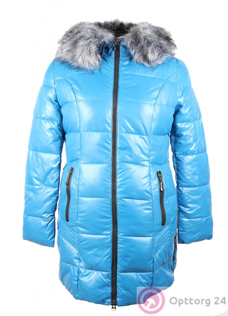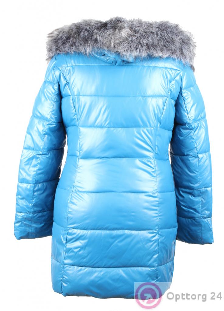 Пуховик женский с искусственным мехом голубого цвета оптом