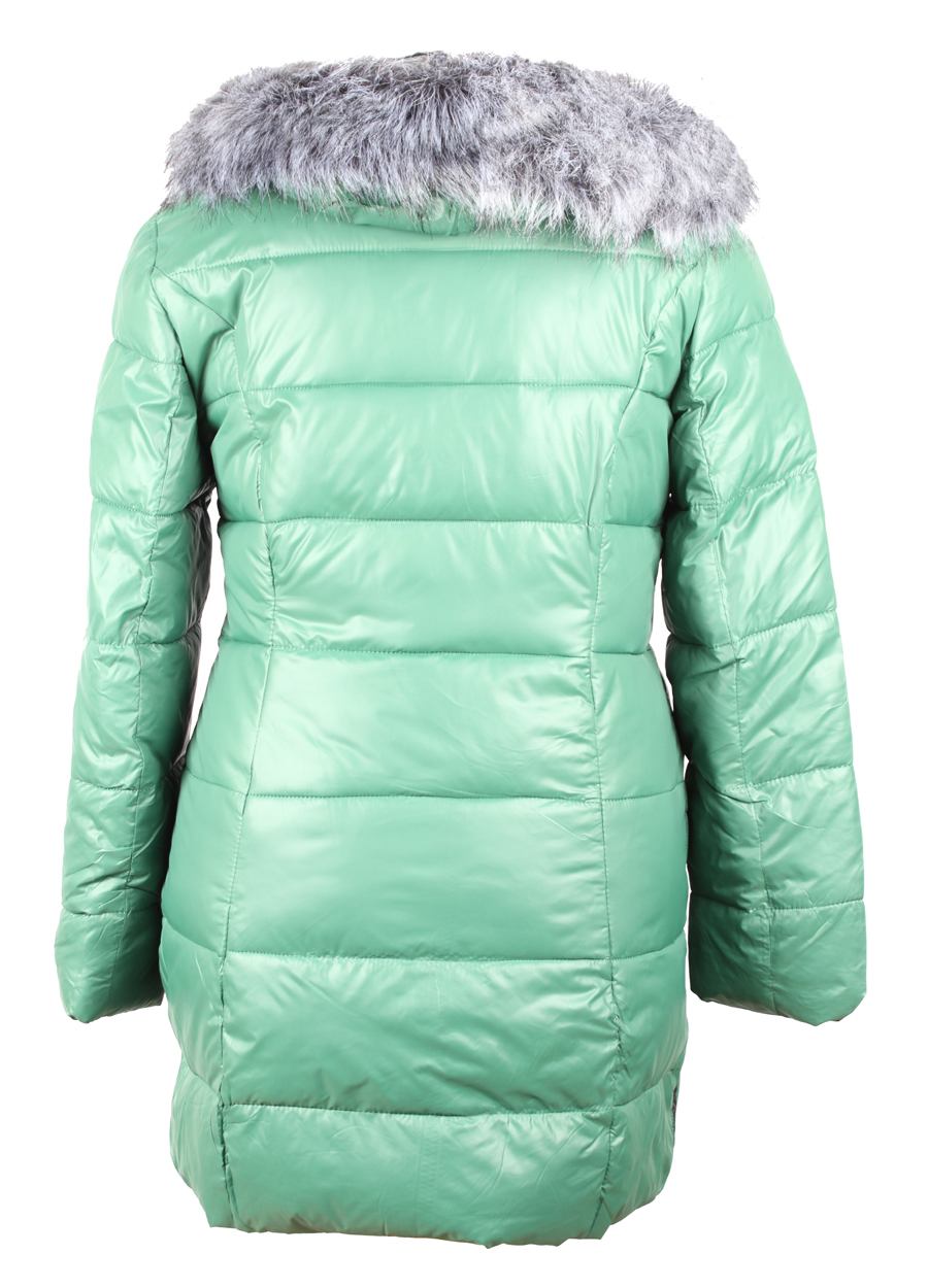 Модный пуховик с капюшоном, дополненным искуственным мехом