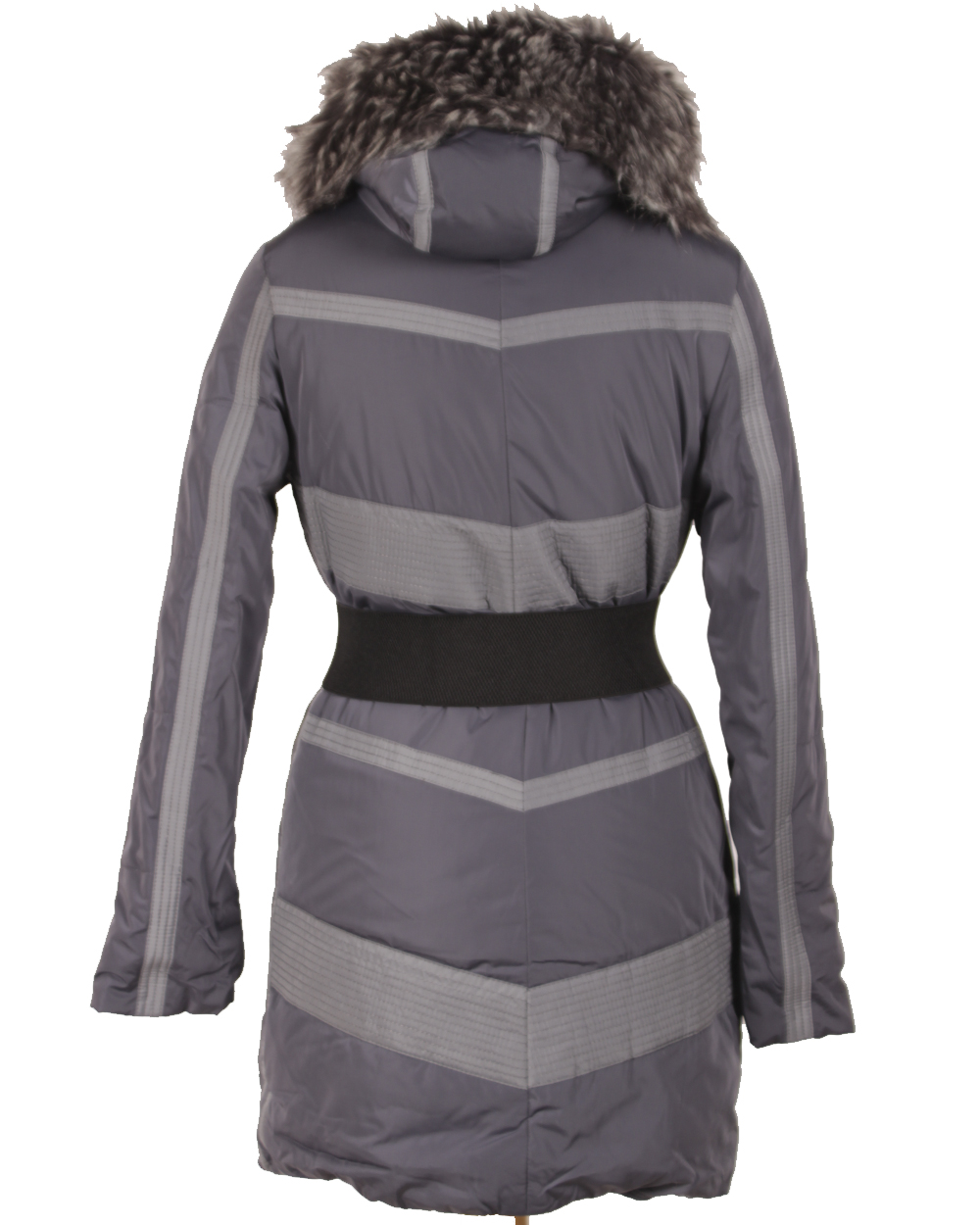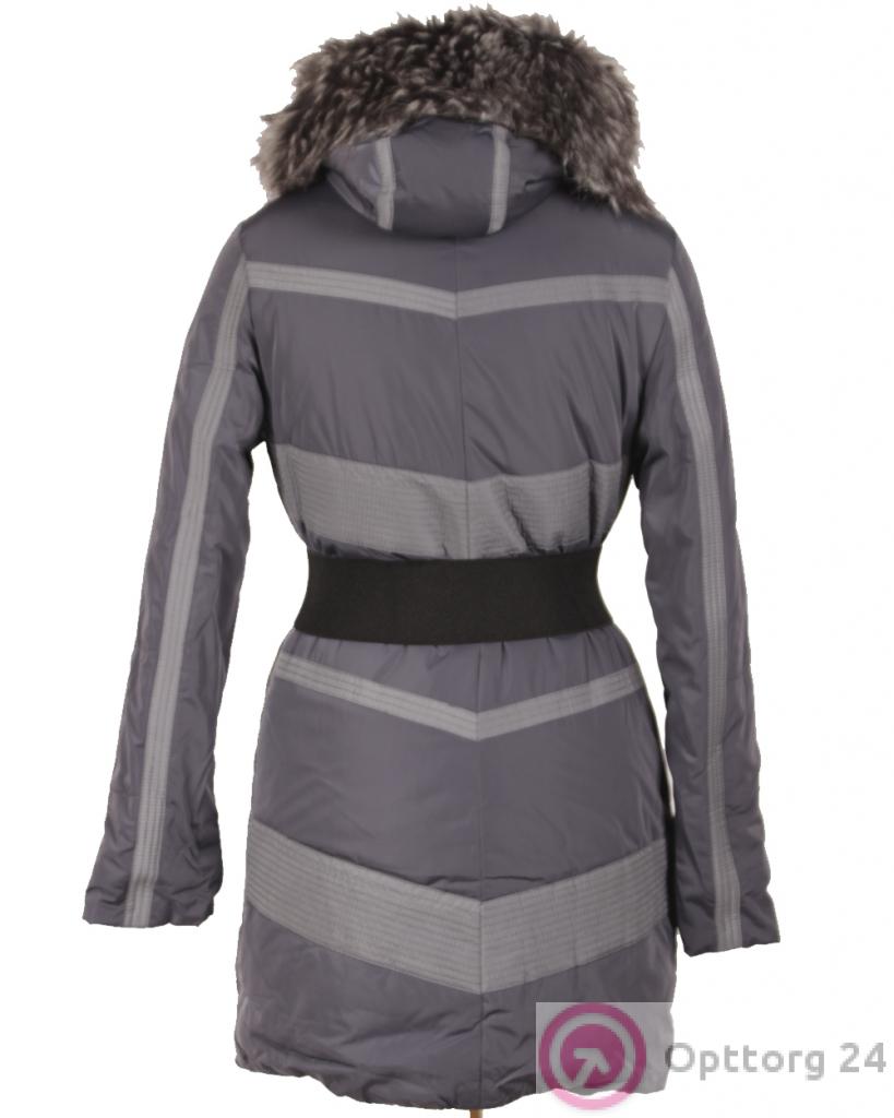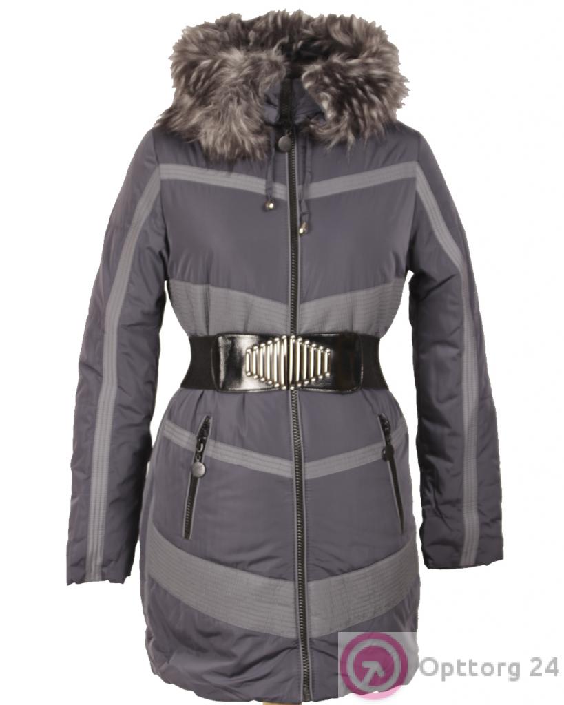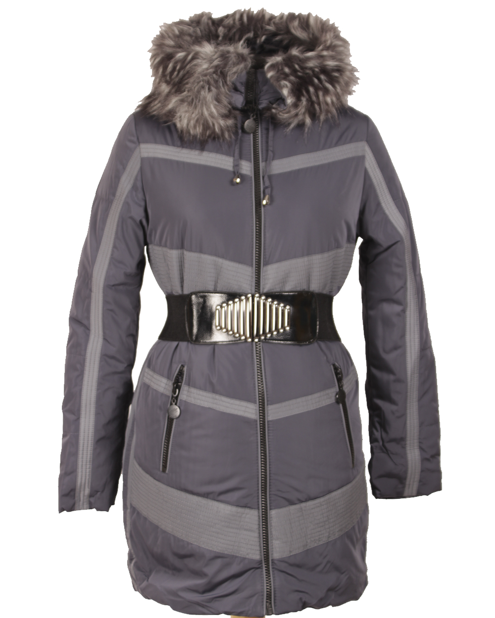 Женская удлинённая куртка с поясом и с капюшоном на меховой подстежке. Украшенная горизонтальными полосками светло серого цвета. Хорошо сочитается с джинсами или брюками.
