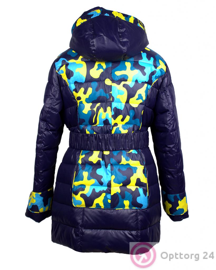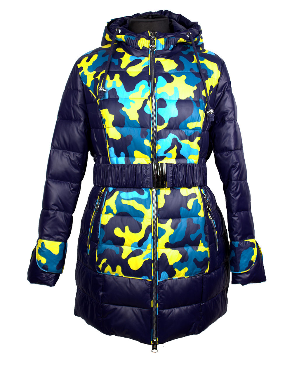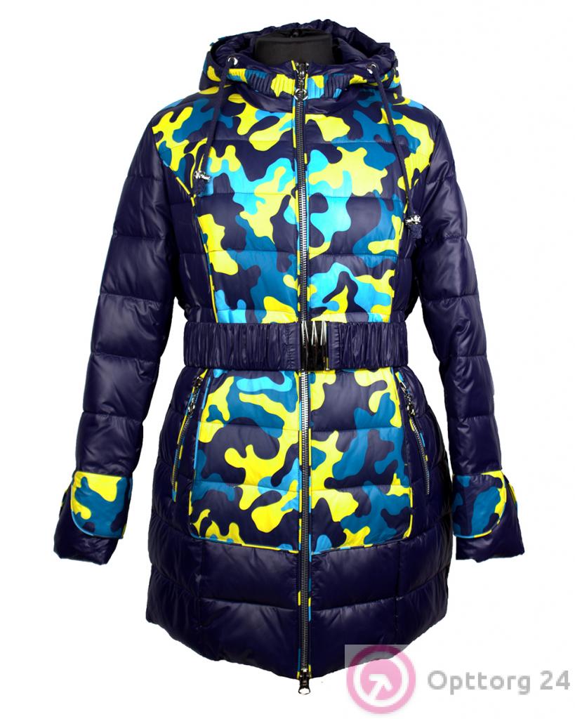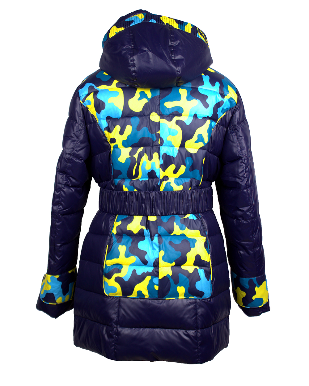 Пуховик женский с жёлто-голубыми камуфляжными вставками тёмно-синий купить оптом