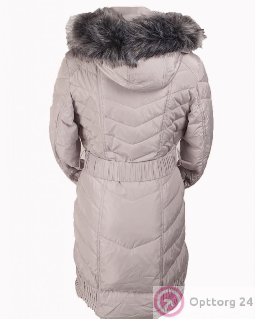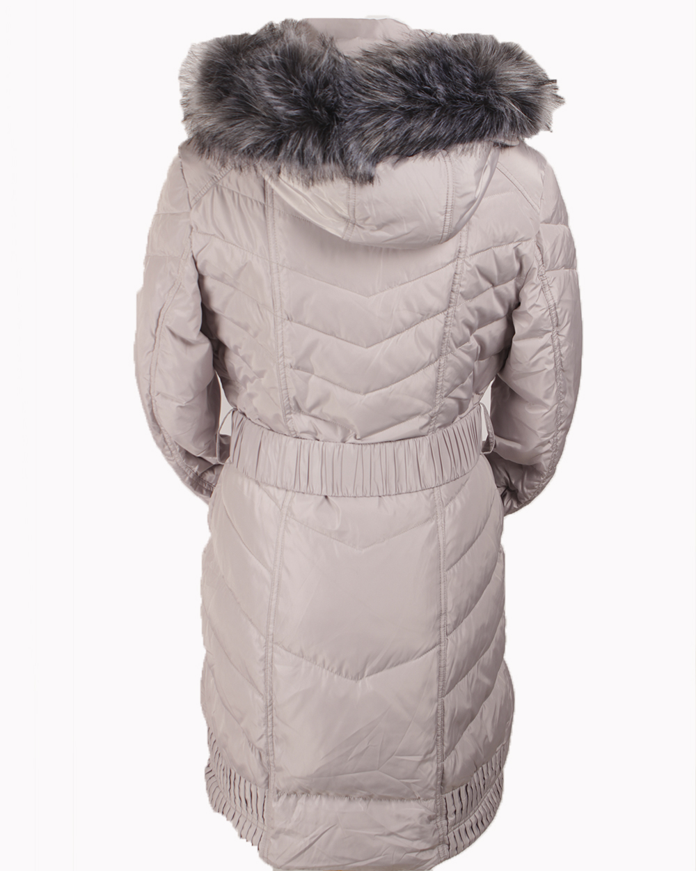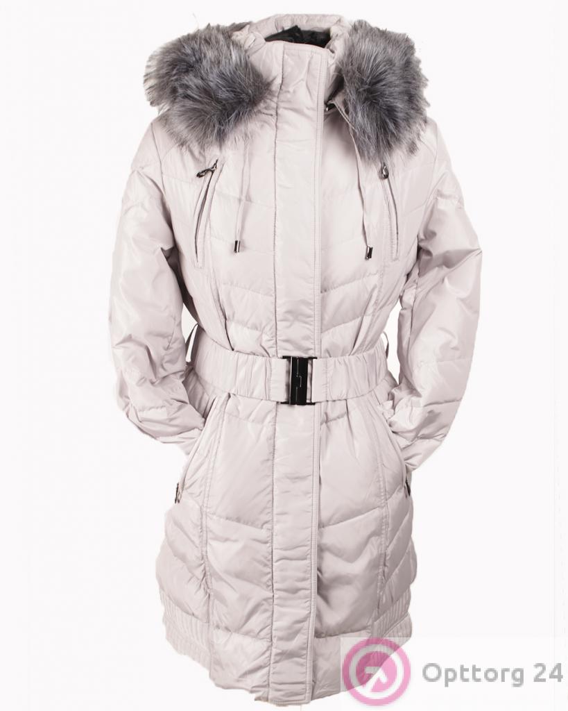 Женский удлинённый пуховик, светло-серого цвета. Ворот украшен натуральным мехом.