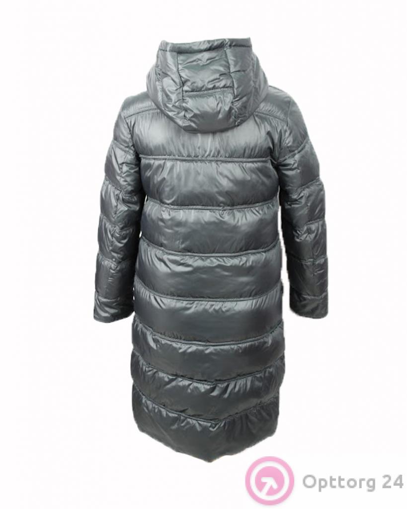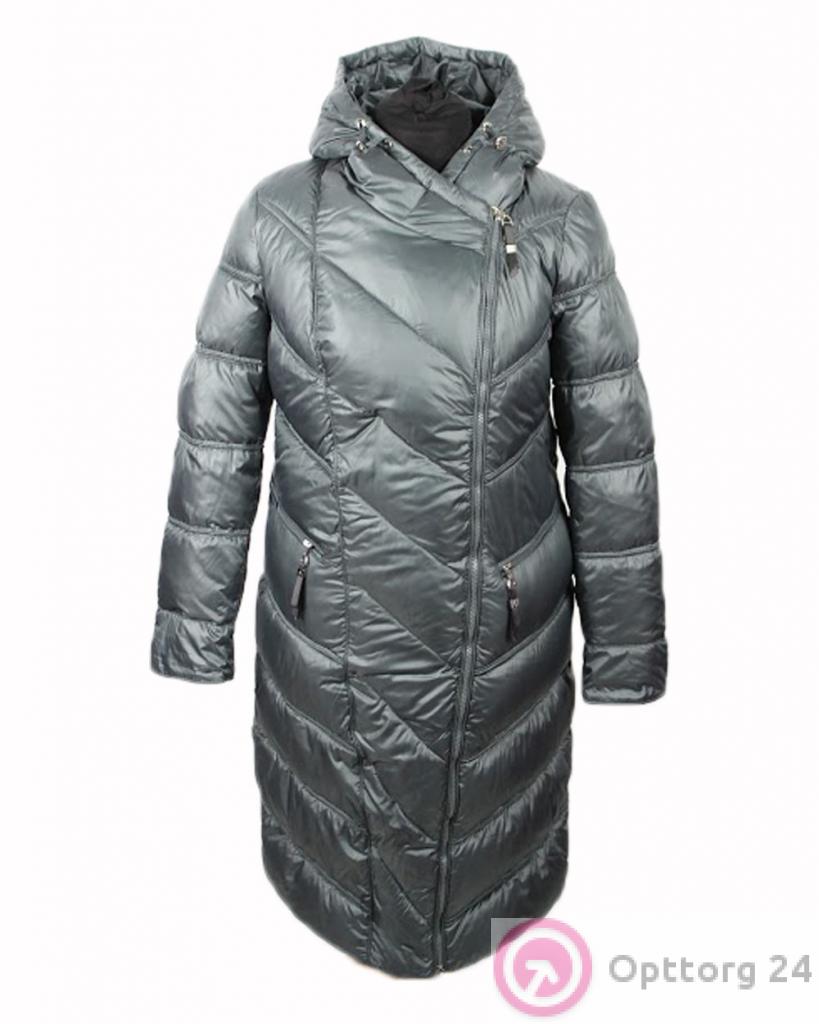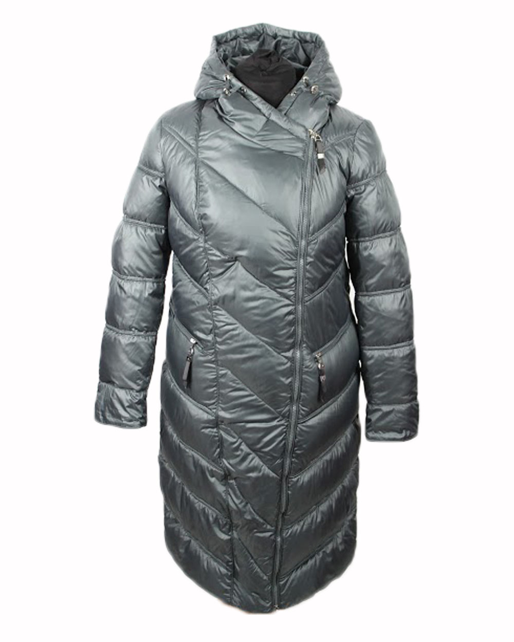 Женский пуховик серого цвета с застежкой на молнию. Карманы на молнии, капюшон не отстегивается.