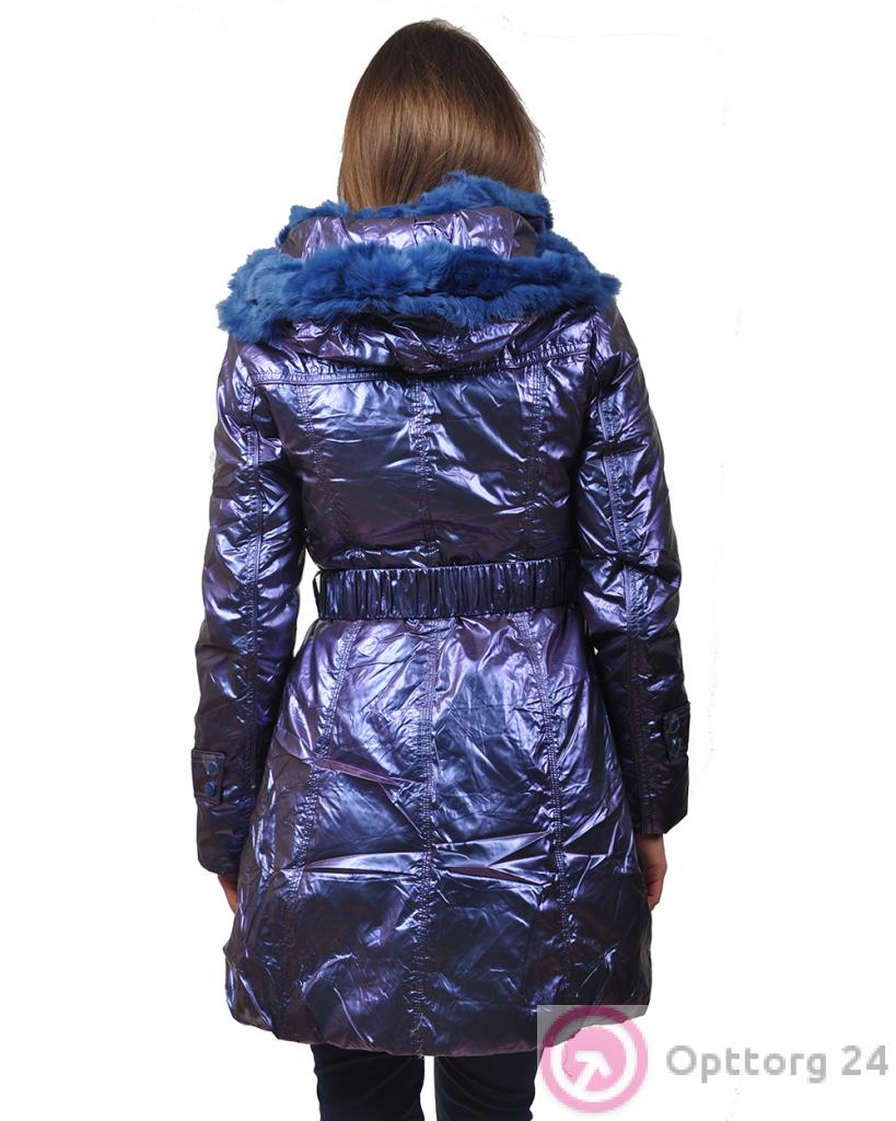 Пуховик женский синий "хамелеон" с опушкой из кролика оптом