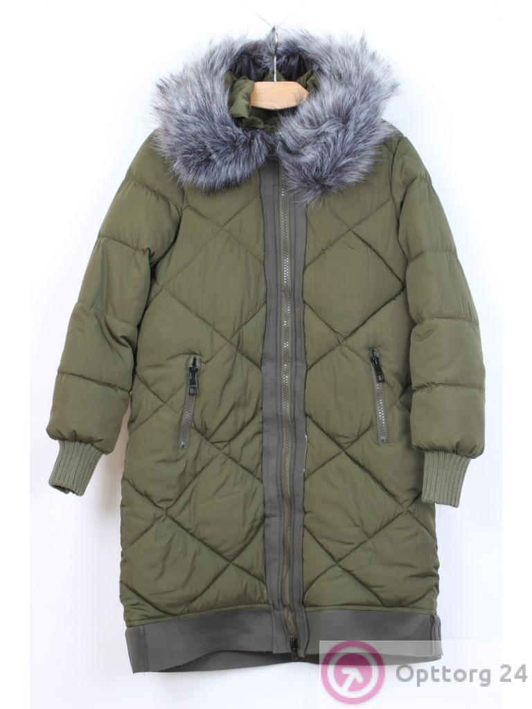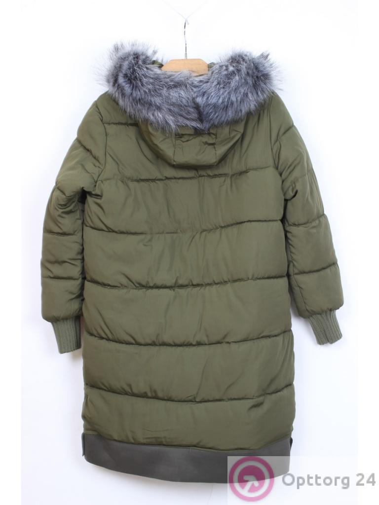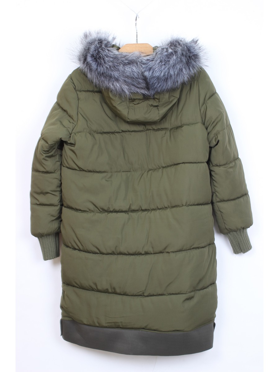 Молодежный пуховик цвета хаки с карманами и капюшоном длиной ниже колена. Стильное и теплое изделие.