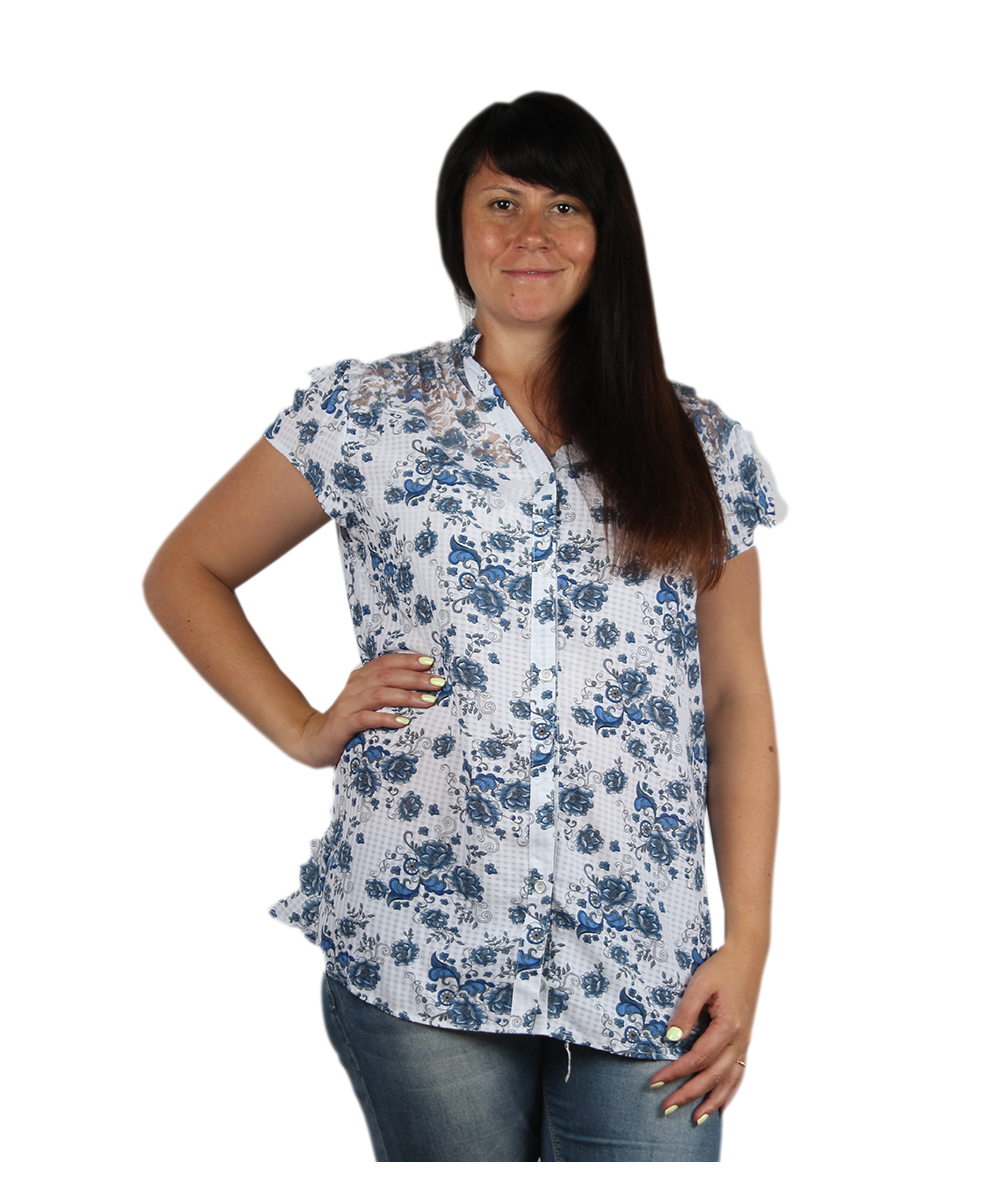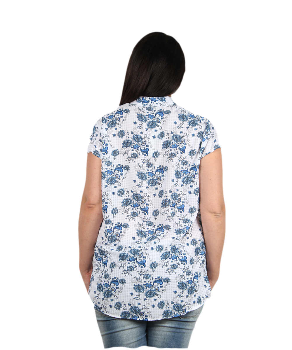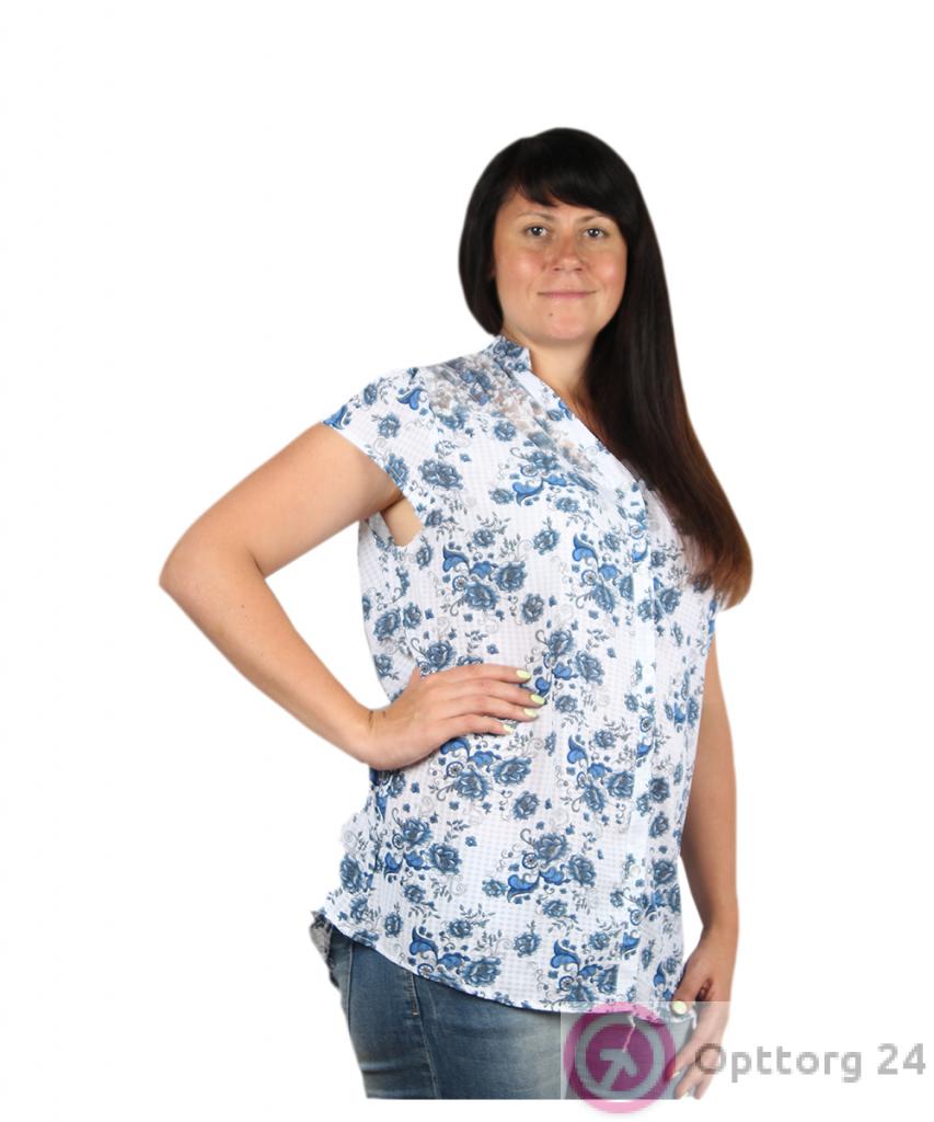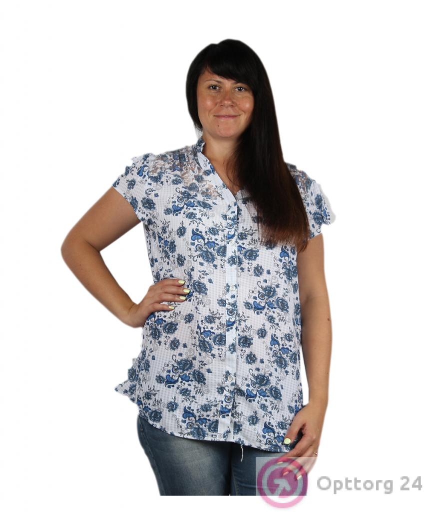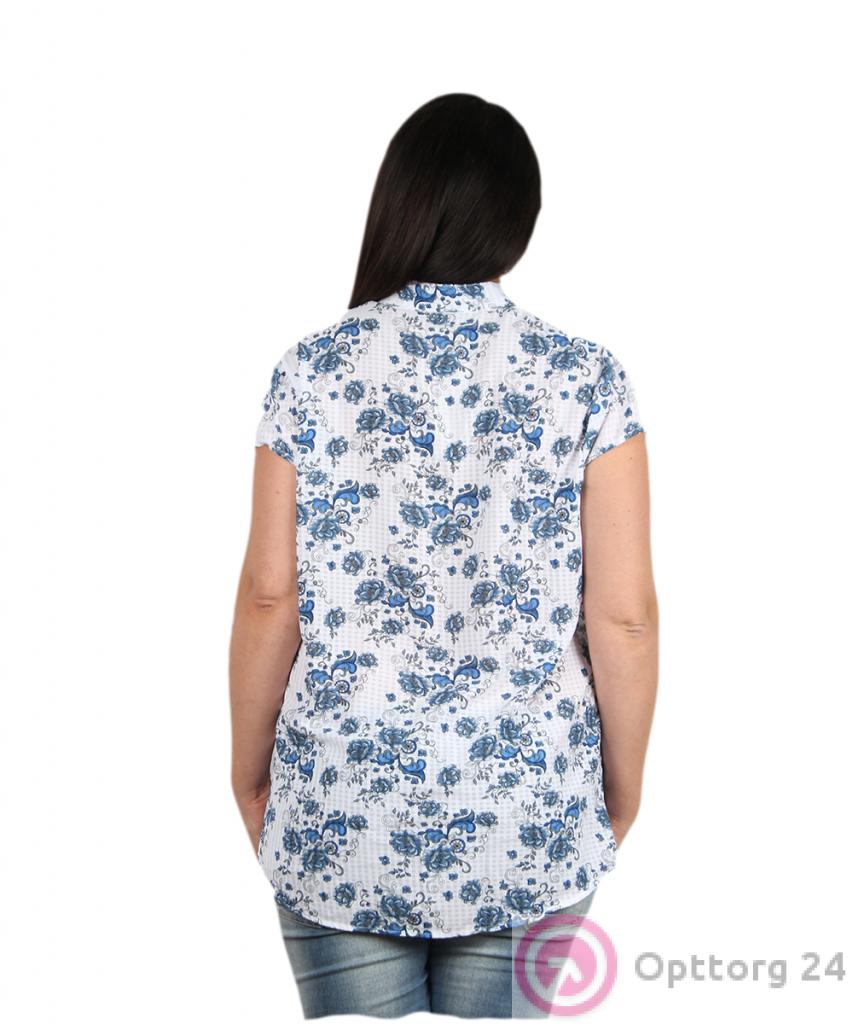 Красивая женская рубашка белого цвета с цветочным принтом. Модель без рукавов, застежка на пуговицы.
