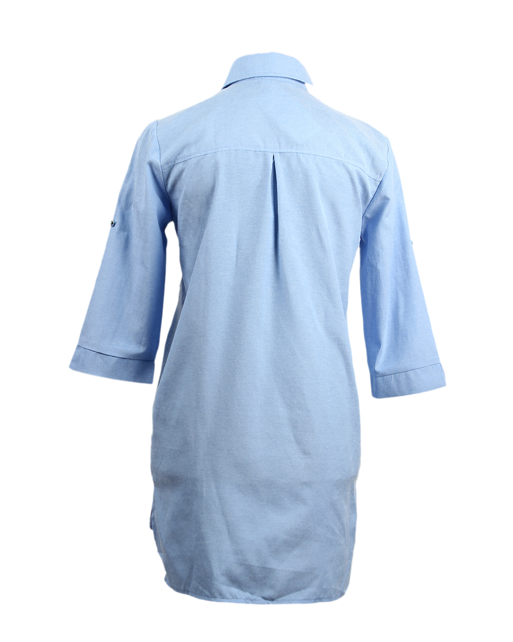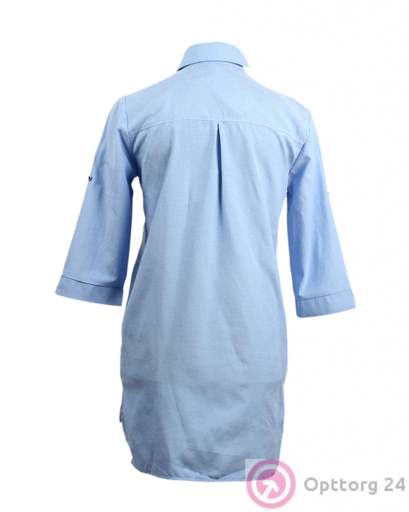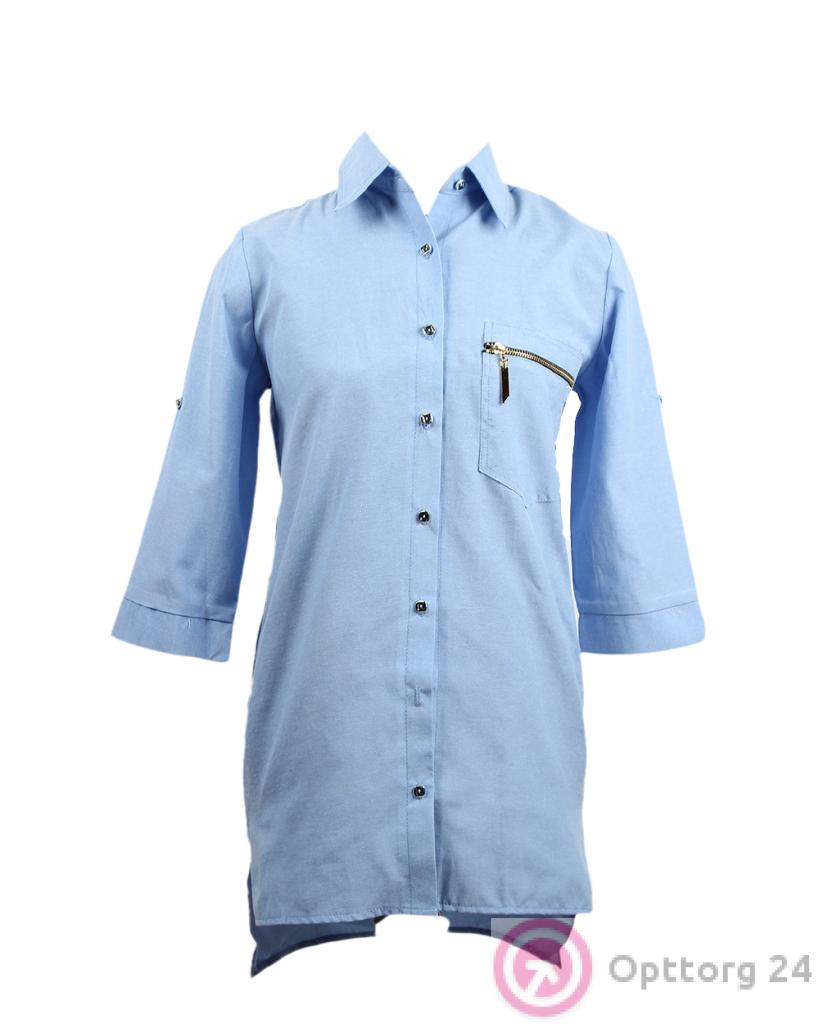 Модная женская рубашка голубого цвета с нагрудным карманом. Модель имеет приталенный крой и застегивается на пуговицы.