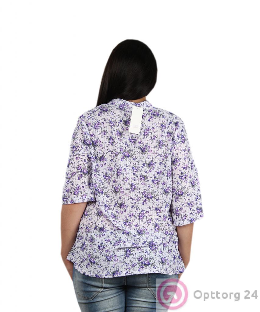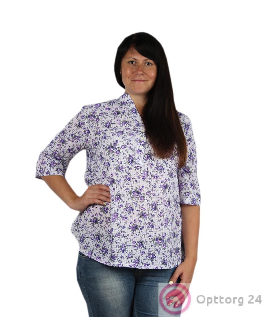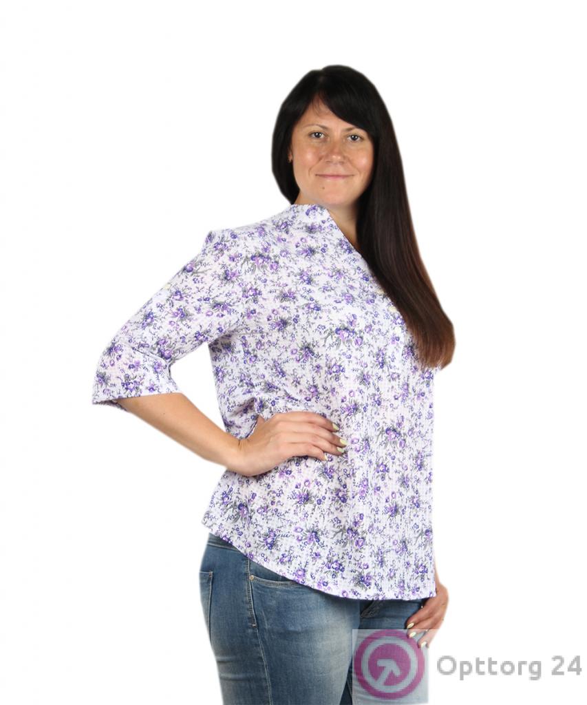Красивая женская рубашка из легкого дышащего материала. Модель имеет приталенный крой, рукава в три четверти и небольшой вырез на горловине.