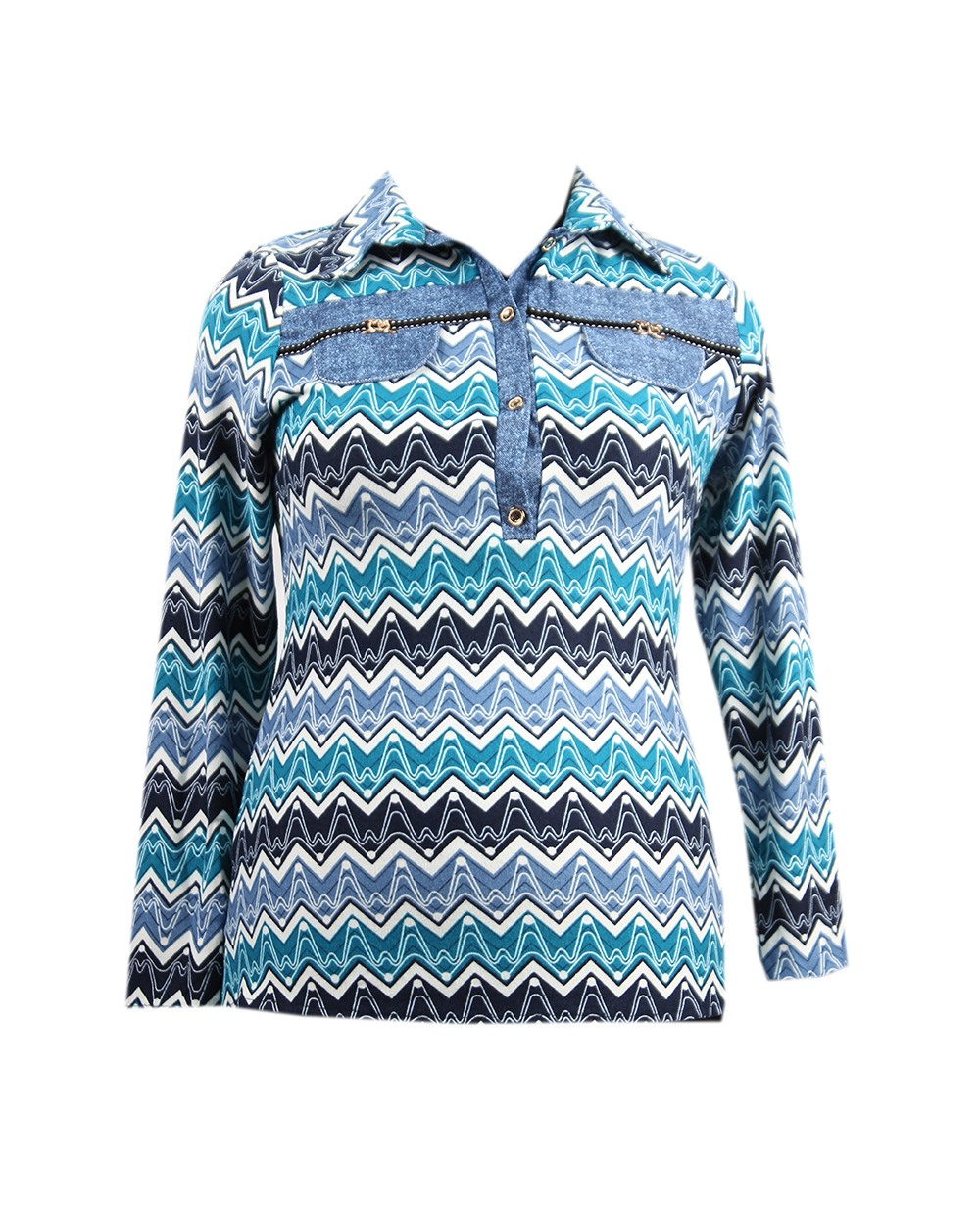 Актуальная женская рубашка с отложным воротником и застежкой на пуговицы. Яркие голубые цвета, золотистые броши спереди.