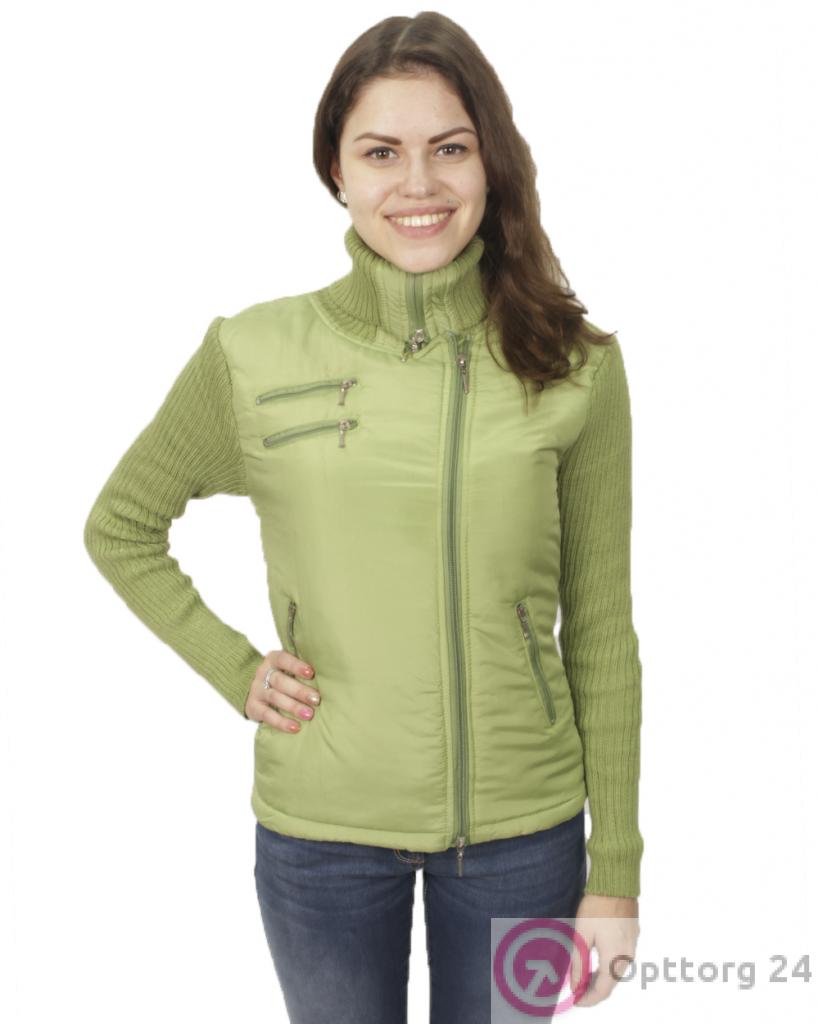 Джемпер - куртка на молнии однотонного салатового цвета с длинным вязанным рукавом.