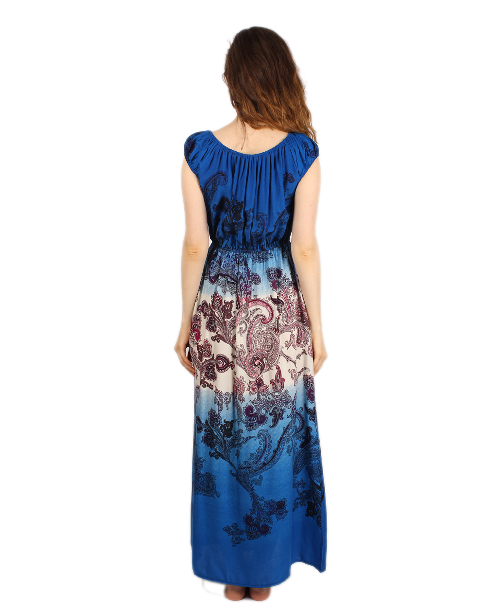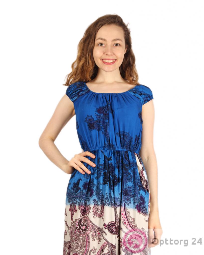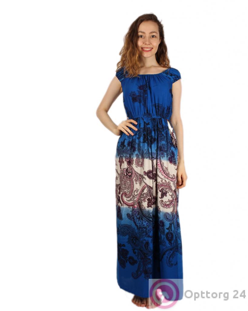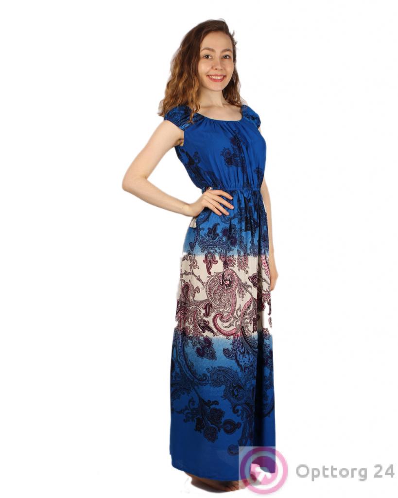 Стильный летний длинный сарафан синего цвета с белой полосой в нижней части изделия. По всему сарафану нанесен красивый печатный узор. Благодаря сочетанию двух контрастных цветов модель очень нарядно смотриться. Горловина и линия талии сарафана отделаны эластичными сборками.