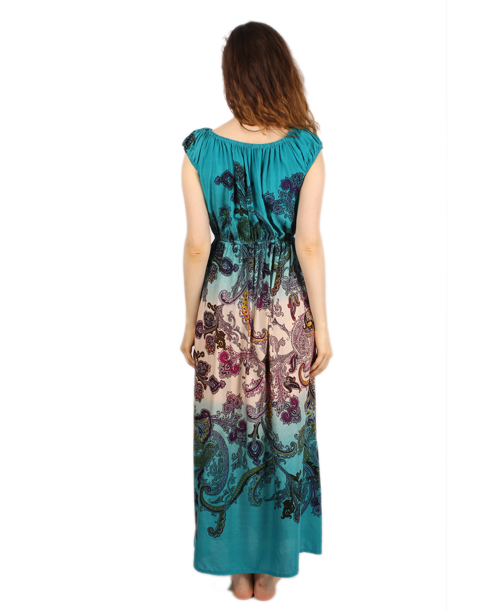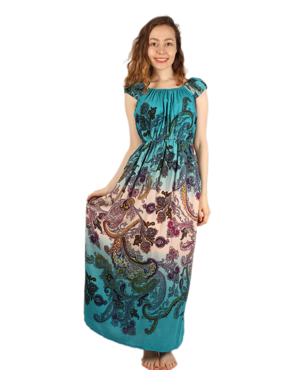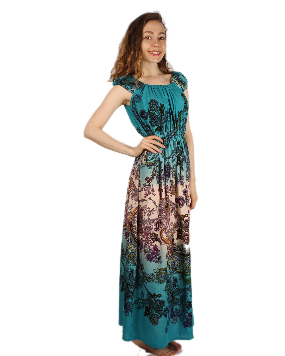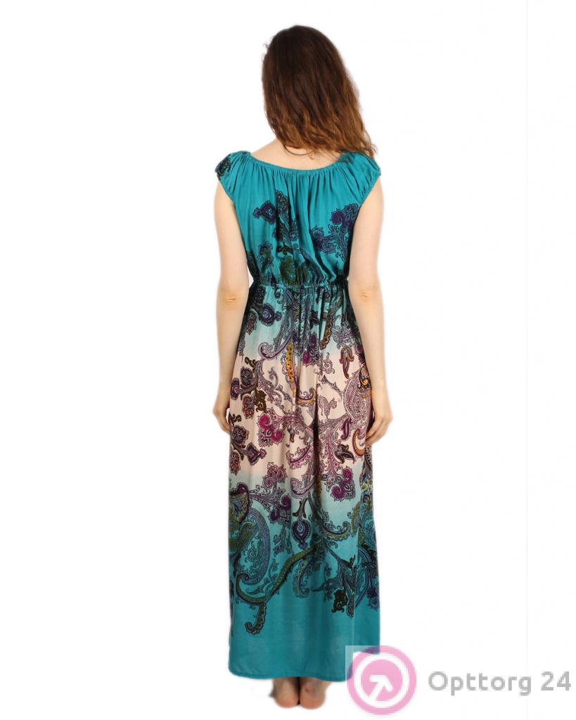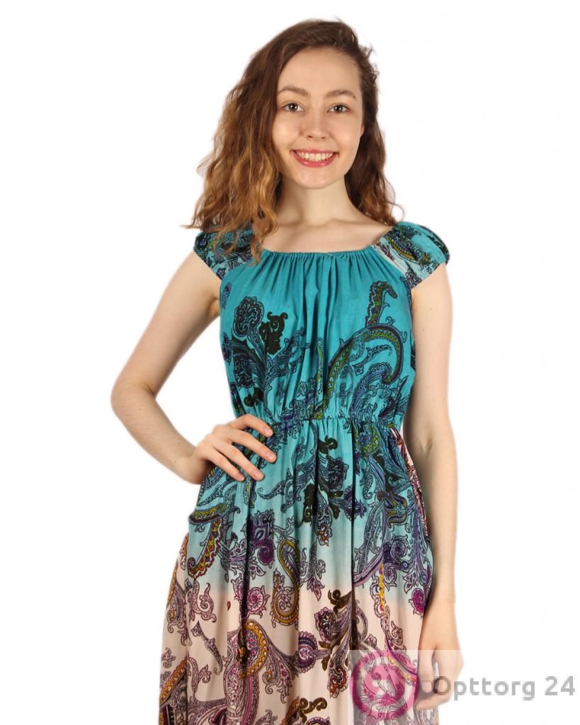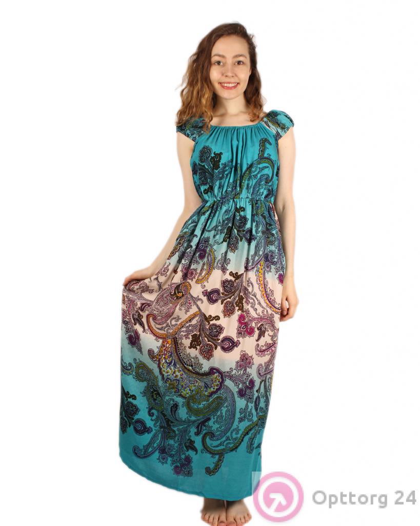 Красивый длинный сарафан бирюзового цвета с белой полоской в нижней части. Модель выполнена из легкого материала, с напечатанным принтом. Модель очень нарядная и практичная. Горловина и линия талии сарафана отделаны эластичной ниткой-резинкой.