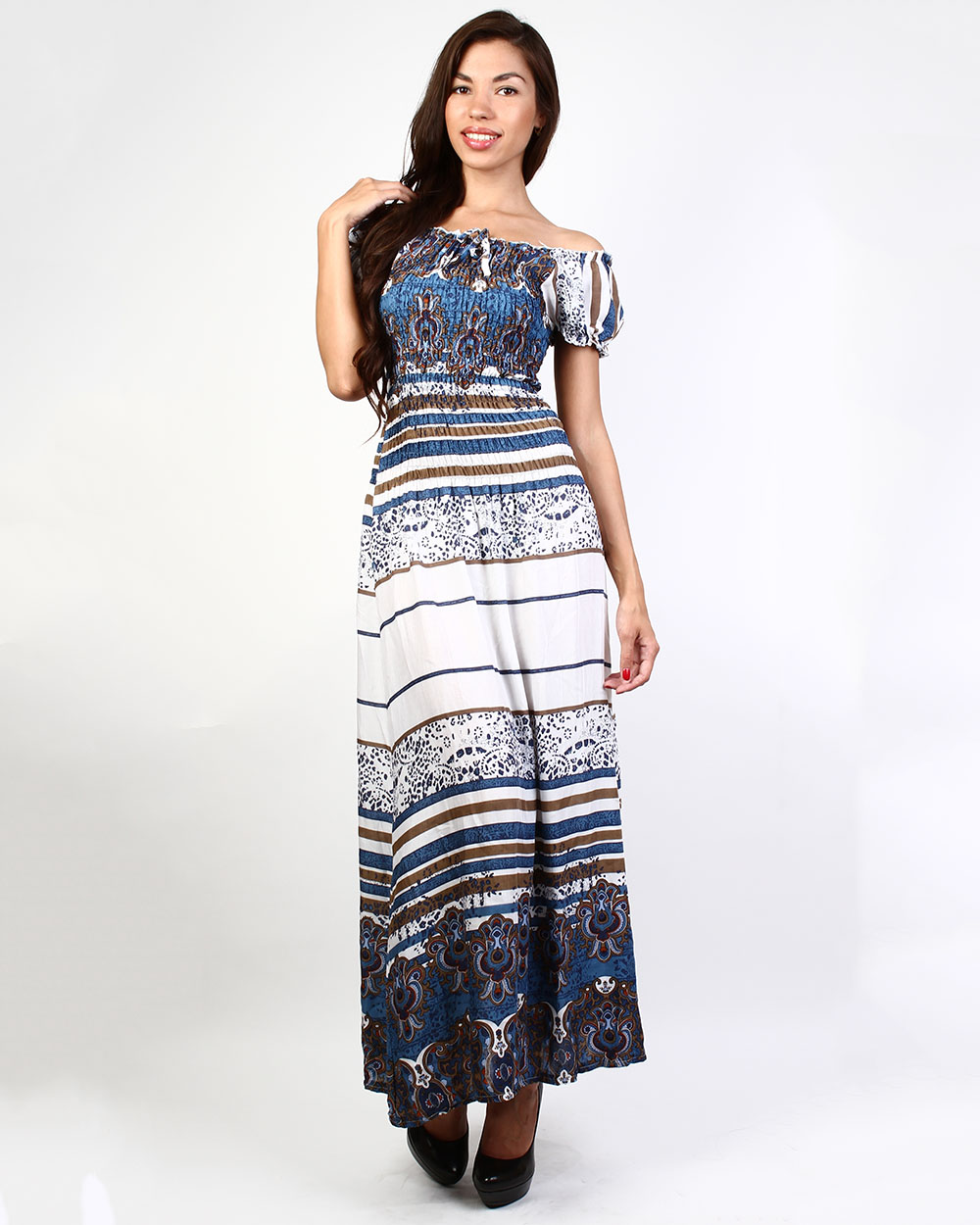 В этом очаровательно сарафане, украшенном незамысловатым принтом, вы сможете увидеть воздушные небесные мотивы, дополненные кружевами этнического северного рисунка.