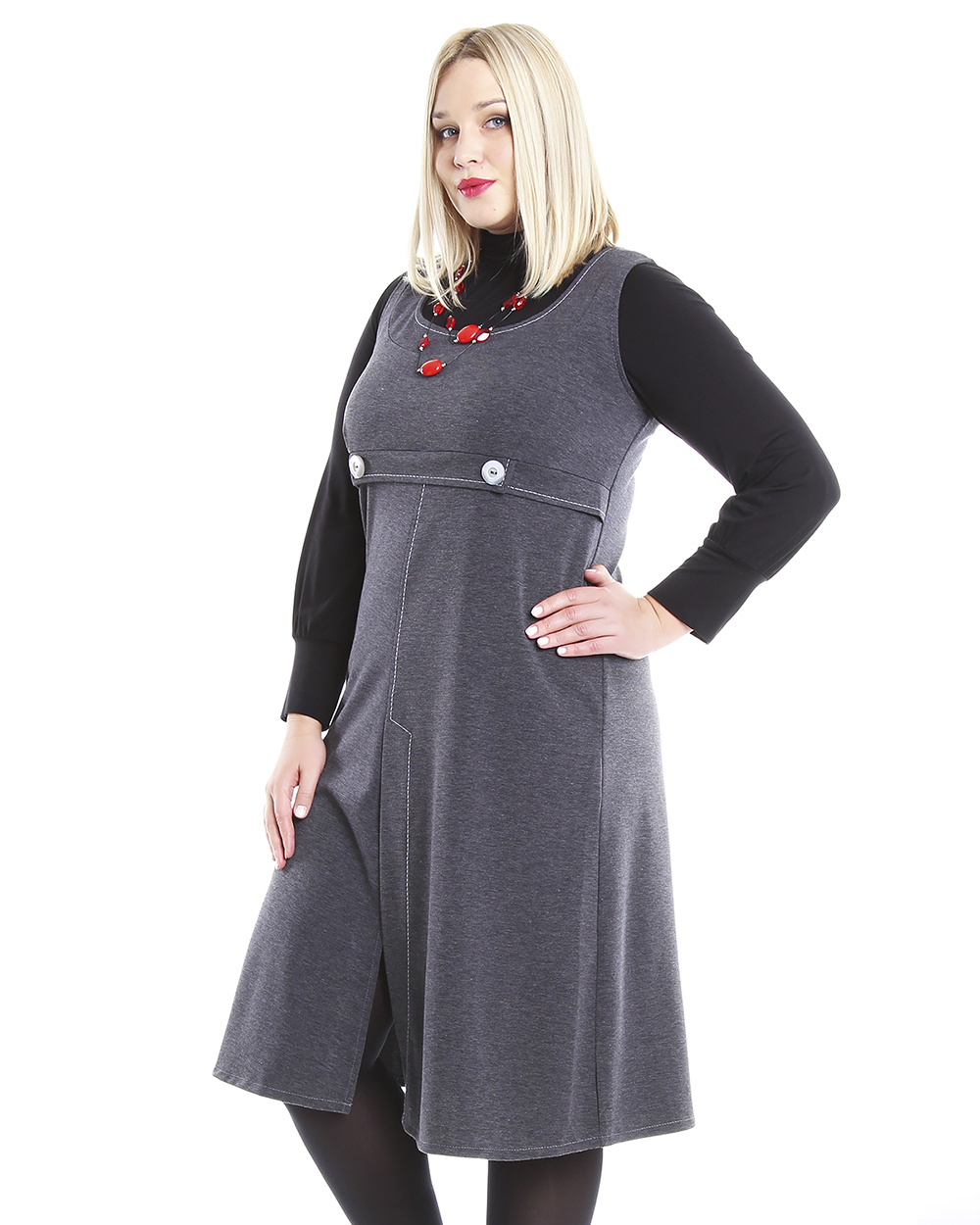 Женский милый сарафан серого цвета, Нежная модель украшена пуговицами в цвет сарафана.
