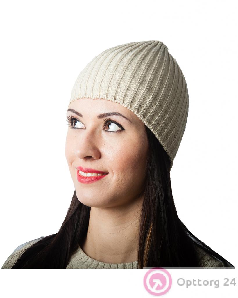 Шапка женская бежевая вязаная в мелкий рубчик оптом
