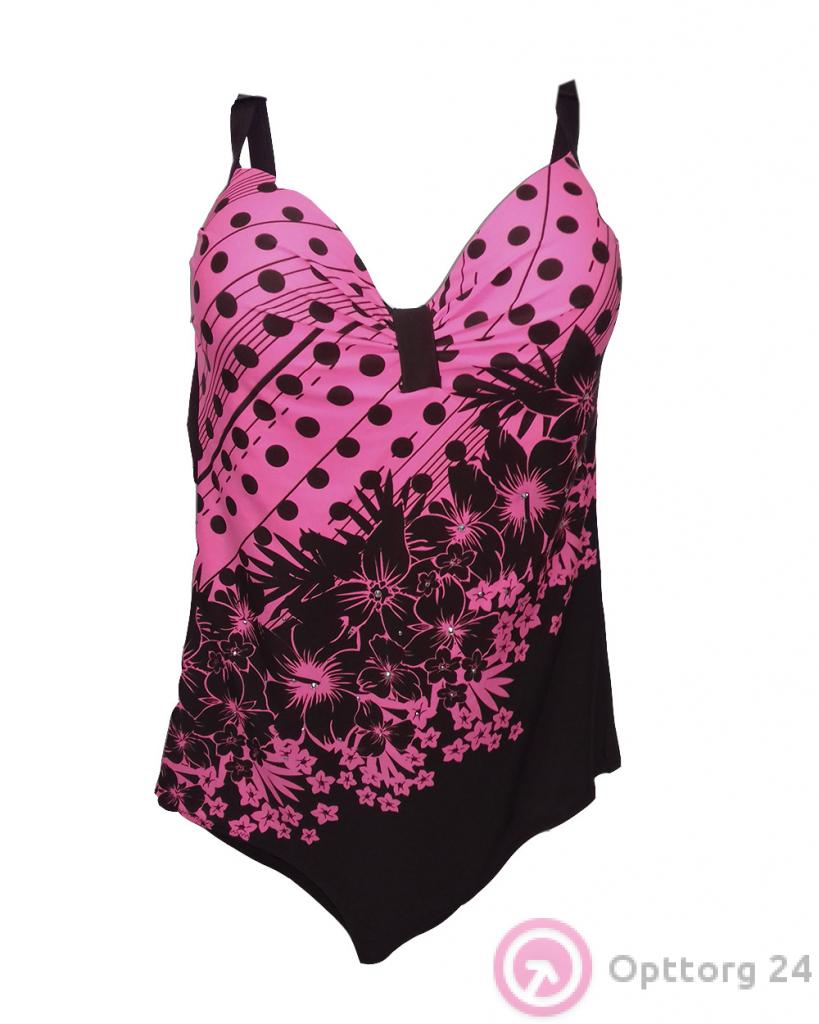 Слитный купальник розовый с цветами и крупными горохами оптом