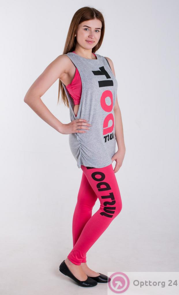 Описание: Спортивный женский костюм тройка, состоит из: майки, топа и брюк. Майка светло-серого цвета, округлая горловина, большой разрез проймы, присборена по бокам. Короткий топ розового цвета. Обтягивающие брюки однотонного розового цвета. Костюм отлично подойдет для повседневной носки, занятий спортом, а в холодный период можно использовать как одежду для дома. При стирке не линяет и не деформируется.