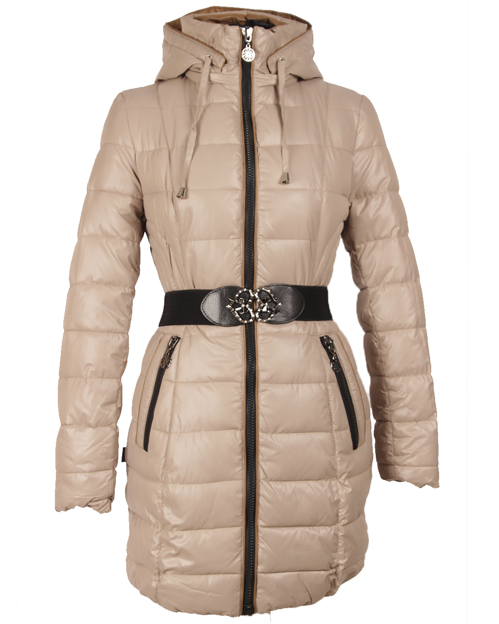 Светлая, стеганая куртка. Изделие с капюшоном, с боковыми карманами на молнии. Куртка прилегающего силуэта с застежкой на молнии и поясом. Идеальный крой стройнит и украшает всех обладательниц.