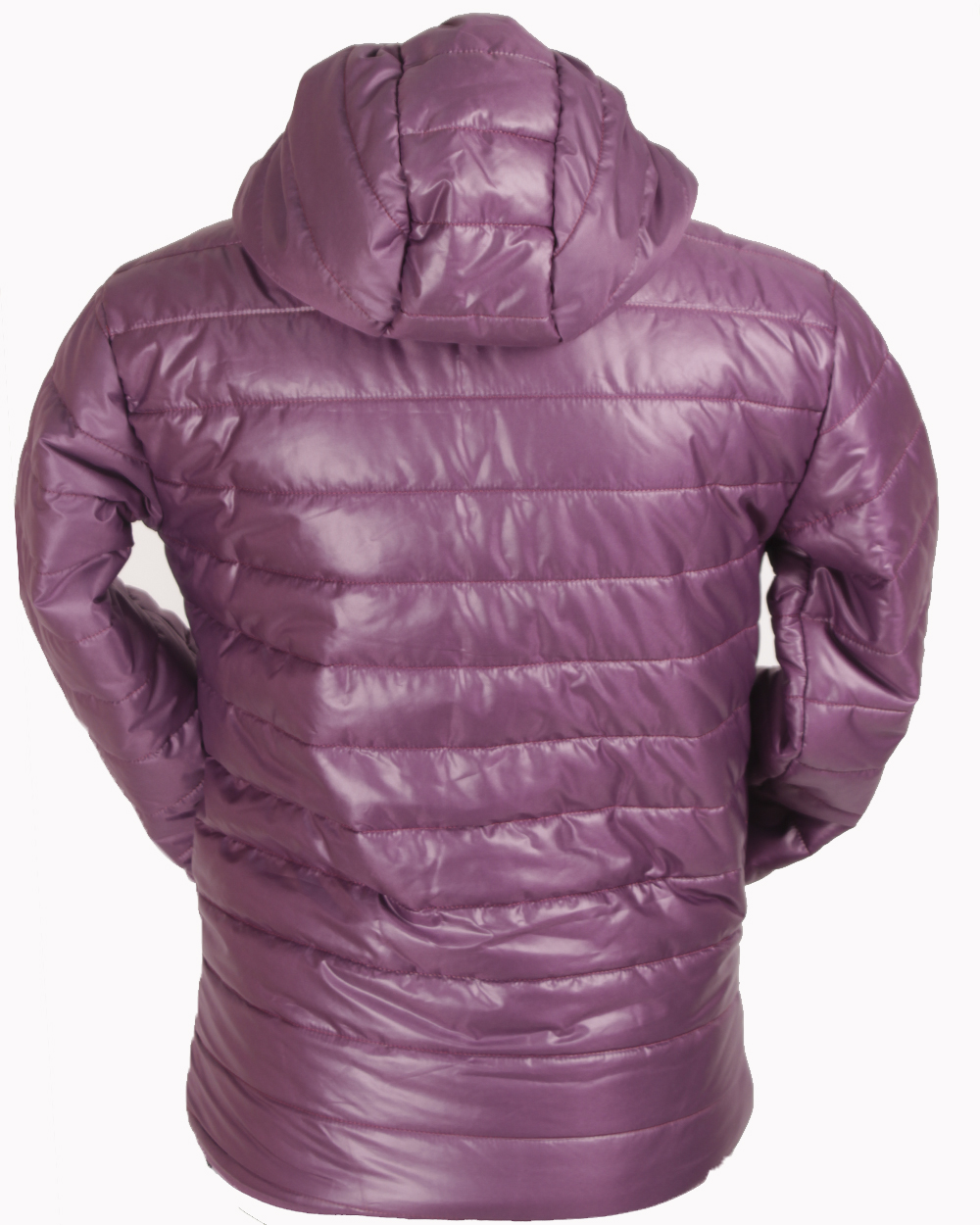 Женская стёганая куртка фиолетового цвета с капюшоном на резинке.