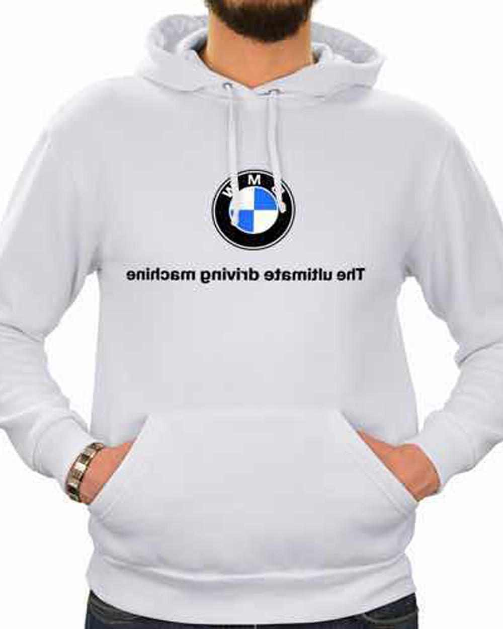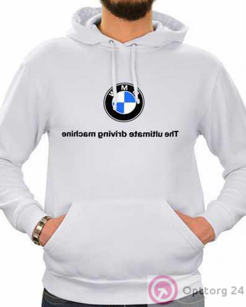 Практичная и удобная толстовка белого цвета с логотипом известного автомобильного брэнда BMW. Модель с капюшоном на затяжках и большими боковыми карманами. Прекрасное дополнение к гардеробу почитателей спортивного стиля.